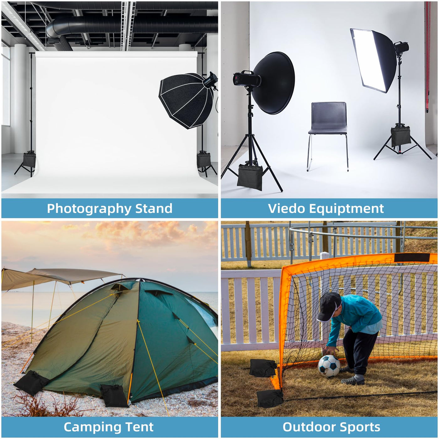 Q: What are the dimensions and weight capacity of each sandbag?A: Each sandbag in the pack can hold a maximum weight of 6 pounds, making them suitable for stabilizing backdrop stands and light stands during shoots.