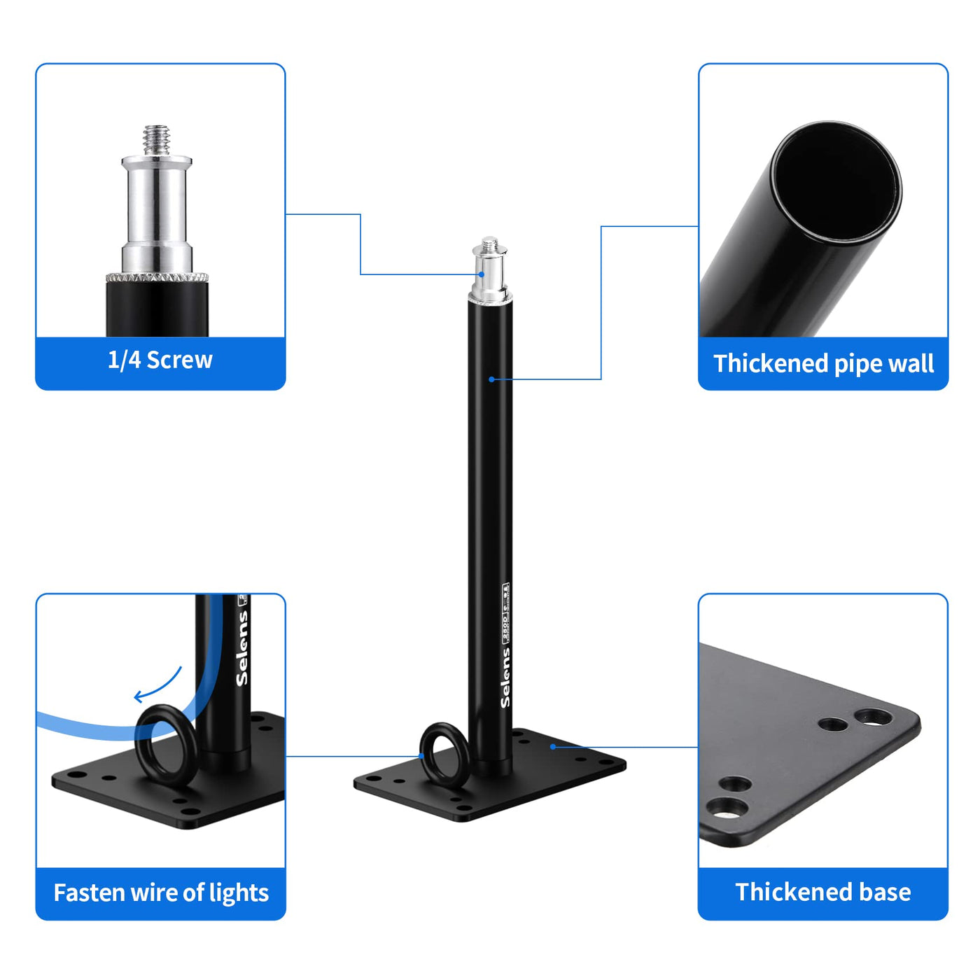 Q: What is the weight capacity of the Selens Camera Ceiling Mount?A: The Selens Camera Ceiling Mount is designed to be sturdy and can support a variety of equipment including video lights, ring lights, softboxes, and reflectors. However, specific weight capacity details are not provided, so it is recommended to ensure that the combined weight of mounted items does not exceed 2.7 kg (6 lbs) for optimal performance.