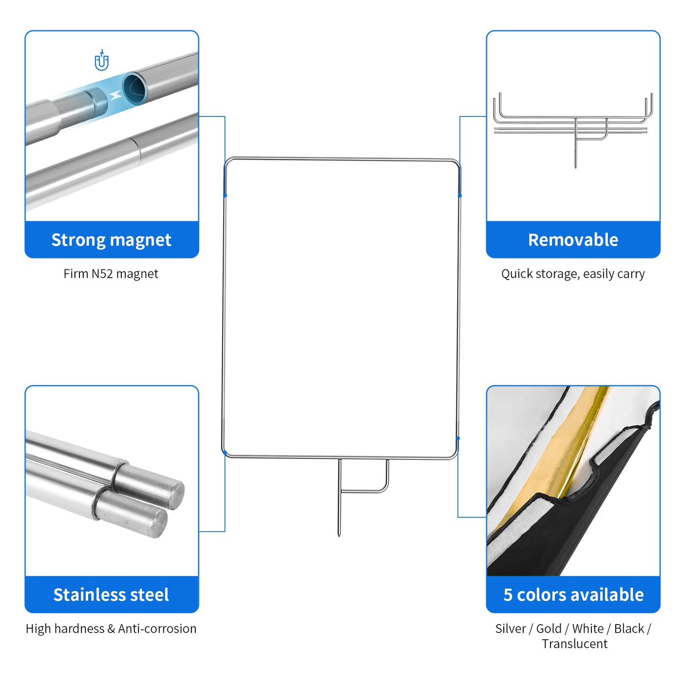 5-In-1 Metal Flag Panel Set Features: Silver Cover: Neutral & Strong Light Reflection. For Creating Catchlight And Increasing The Exposure Of The Subject. Gold Cover: Warm Fill Light ,Give The Picture A Warm Feel. For Portraits And Animals Photo Shooting. White Cover: Softer & Natural Fill Light. Light Reflection Is Softer Than The Silver One. Black Cover: Subtract Light, Weaken The Picture Color Saturation And Make The Color Tone More Natural Diffuser: Soften Direct Light Reflector Comes With Four Different Reflective Surfaces And One Translucent Diffuser For All Of Your Lighting Needs. They Are The Most Popular Reflector In Photograph, Suitable For Studio Or Outdoor Photography. Made Of Premium Fabric, No Fading, Soft Reflection. Double-Layered Edge Increase The Durability. Specifications: Size: 30X35In/75X90Cm Color: Gold, Silver, White, Black, Translucent Shape: Rectangular Removable Stainless Flag Frame Package Contents: 1 X 5-In-1 Flag Panel (White/ Black/ Silver/ Gold Cloth And Transluscent Diffuser) 1X Flag Frame Note: Four-Color Cloth Is The Four Sides Of A Cloth Cover. Others Are Not Included, For Demo Purpose Only