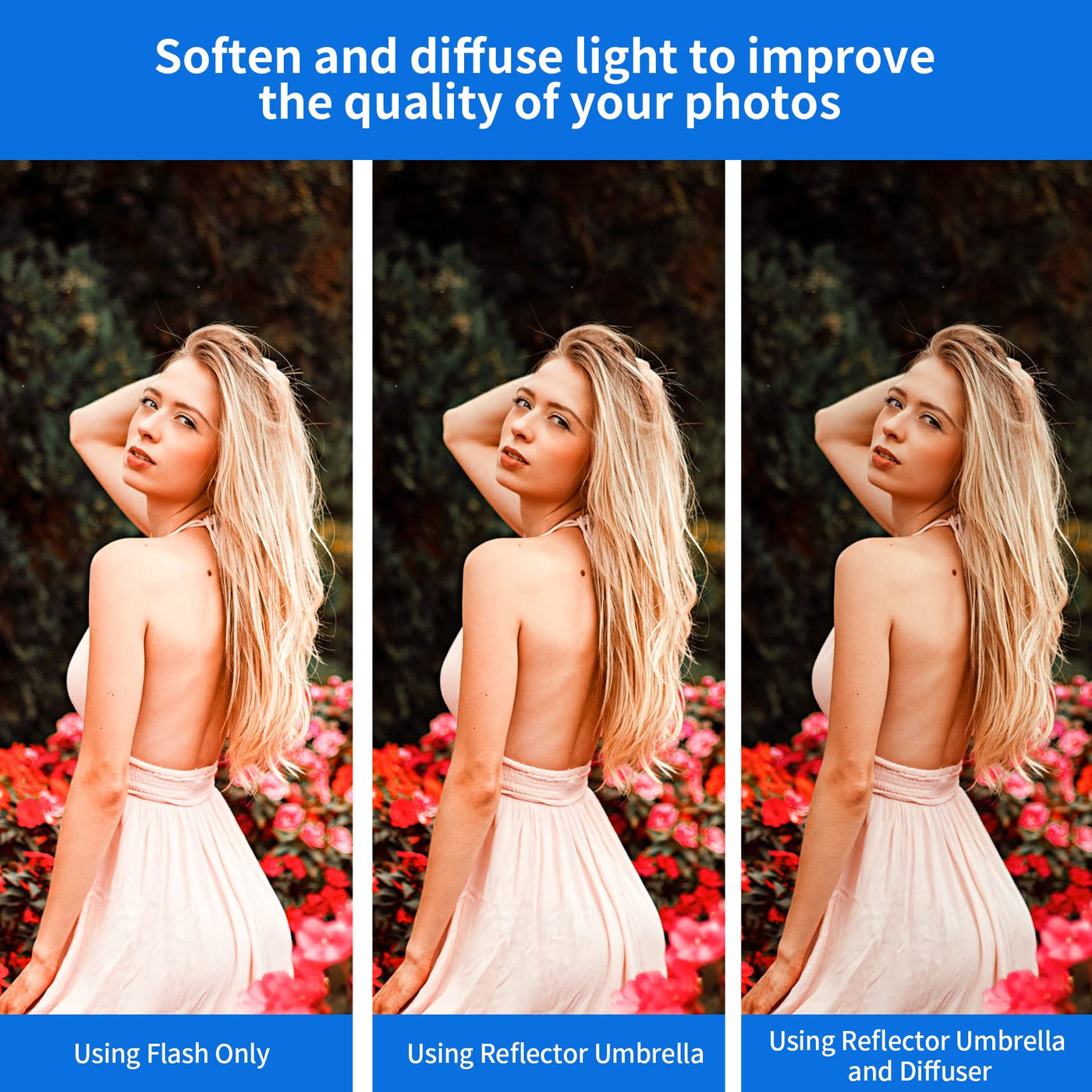 Q: How does the removable soft diffuser affect lighting?A: The removable soft diffuser allows you to create a softer lighting beam spread, reducing harsh shadows and providing a more flattering light for portrait photography.