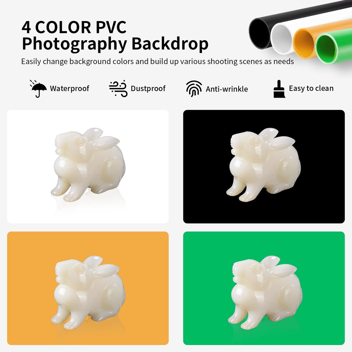 Q: Are the backgrounds provided with the light box easy to clean?A: Yes, the light box comes with four detachable PVC backdrops that are anti-dirt and waterproof, allowing you to easily clean any stains or dust with a wet towel.