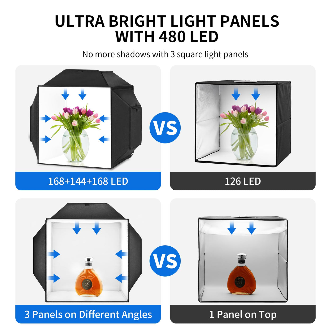 Q: How does the stepless dimming feature work?A: The light box is equipped with three LED light panels that offer stepless dimming from 1% to 100%, allowing you to adjust the brightness to achieve the perfect lighting for your photography.