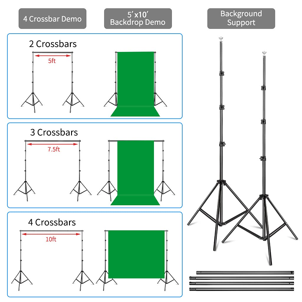 Introductions: With Our Backdrop Support Stand Set, You Can Do Fashion Shots, Video Filming When The Studio Space Is Limited, Also Can Pack Them All Up As A Travel Set. Pure White Daylight, It Is Just Made For Photography. Made Of High Quality Material, It Is Durable And Sturdy For You To Use. And It Is Suitable For 6.5Ftx10Ft Backdrop. It Is Easy To Collect All The Accessories And Can Be Taken Outside Conveniently. A Good Product You Can'T Miss! Features: 1. Made Of High Quality Material, It Is Durable And Sturdy 2. It Is Easy To Collect All The Accessories And Can Be Taken Outside Conveniently 3. It Is Brand New And High Quality 4. Ultimate Soften Light Stream And Remove Shadow To Make Perfect Shooting 5. Set Up In Mins To Offer You A Professional Photo Studio 6. Energy Saving Light Bulbs Specifications: 1. Brand: Showmaven 2. Color: Black 3. Light Stand Height: 6.4Ft 4. Suitable For: 6.4Ft(Height)*10Ft (Wide)Backdrop 5. Pipe Diameter:22-19-16Mm(Light Stand) 6. Splice Length: 10Ft(Cross Bar) 7. Pipe Diameter: 22Mm(Cross Bar) Package Includes: 2 X Backdrop Support Stands (Pipe Diameter:22-19-16Mm) 4 X Cross Bars Extend To 10Ft Wide 1 X Carrying Case 2X Fish Mouth Clip 1 X English Manual & English Installation Instruction
