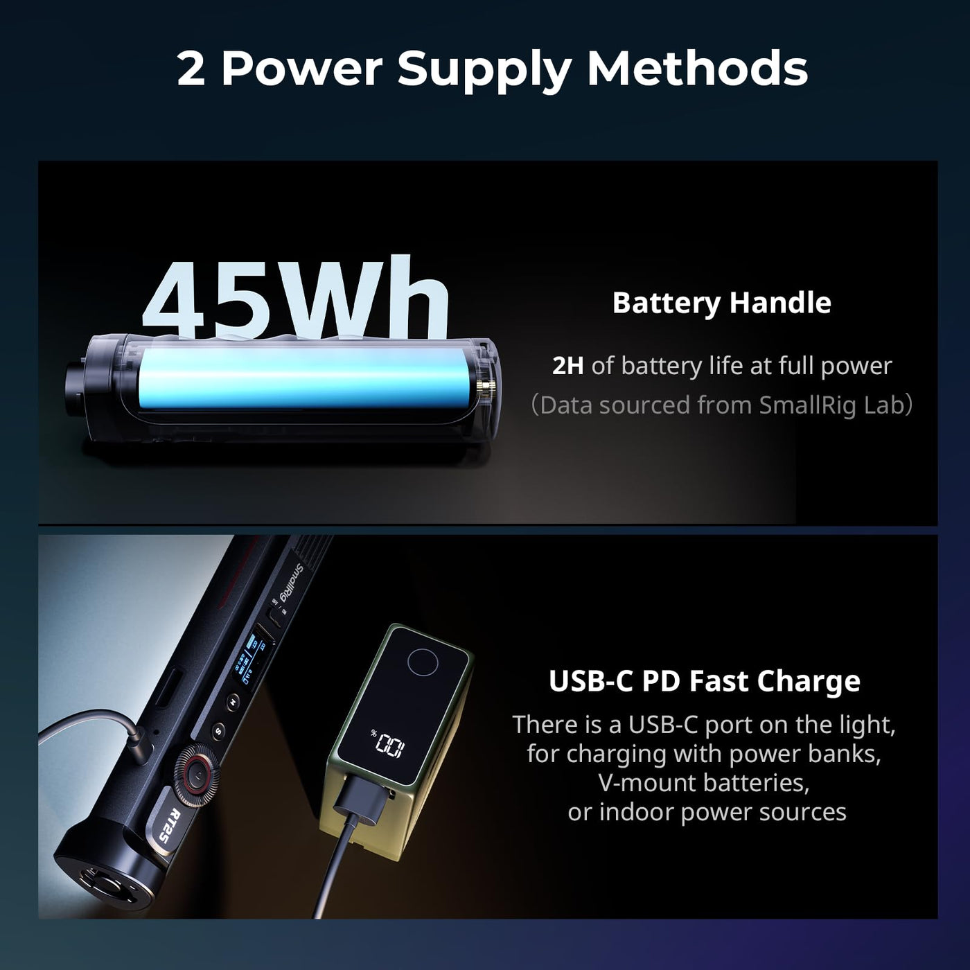 Q: What power supply options does the SMALLRIG RT25 offer?A: The SMALLRIG RT25 can be powered by its 45Wh battery handle, which provides up to 2 hours of full-power usage. Additionally, it supports USB-C charging, allowing for fast charging via power banks, V-mount batteries, or other indoor power sources.