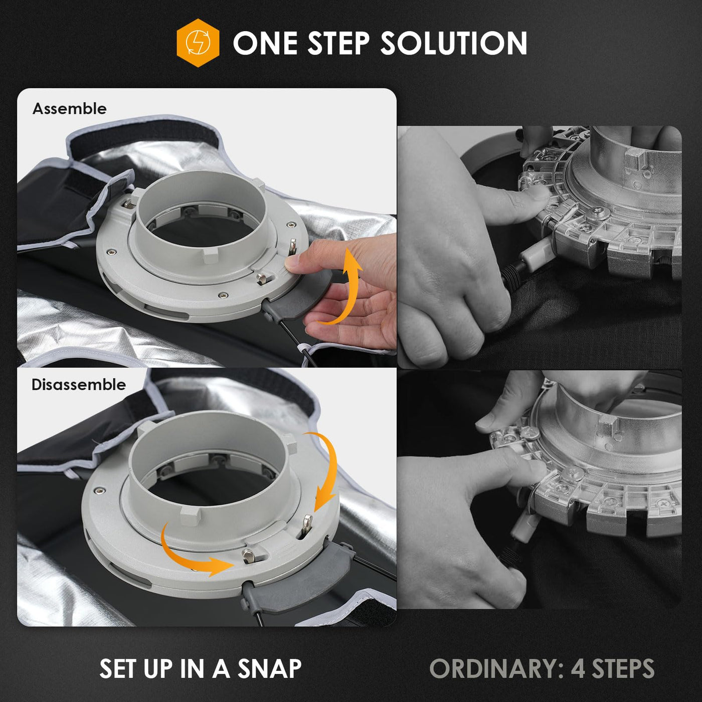 Q: How easy is it to set up the TARION Foldable Bowens Softbox?A: The TARION Foldable Bowens Softbox is designed for quick and easy setup with its innovative Quick Lock mechanism. You can assemble and disassemble the softbox in just 1 second, making it ideal for photographers who need to transition quickly between locations or setups.