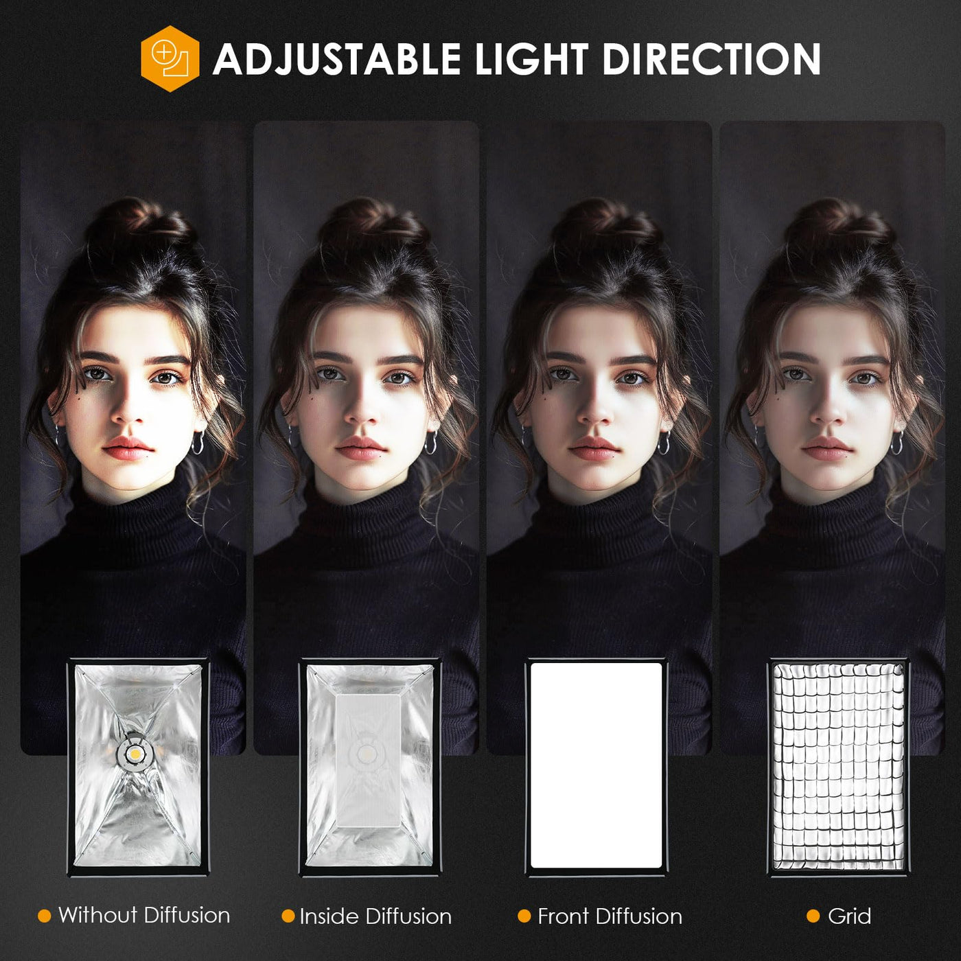 Q: What features help control the light with this softbox?A: The TARION softbox comes with a honeycomb grid and two diffusers. The honeycomb grid allows you to control the direction of the light, creating dramatic effects and enhancing facial features, while the diffusers help soften the light for a more natural look.