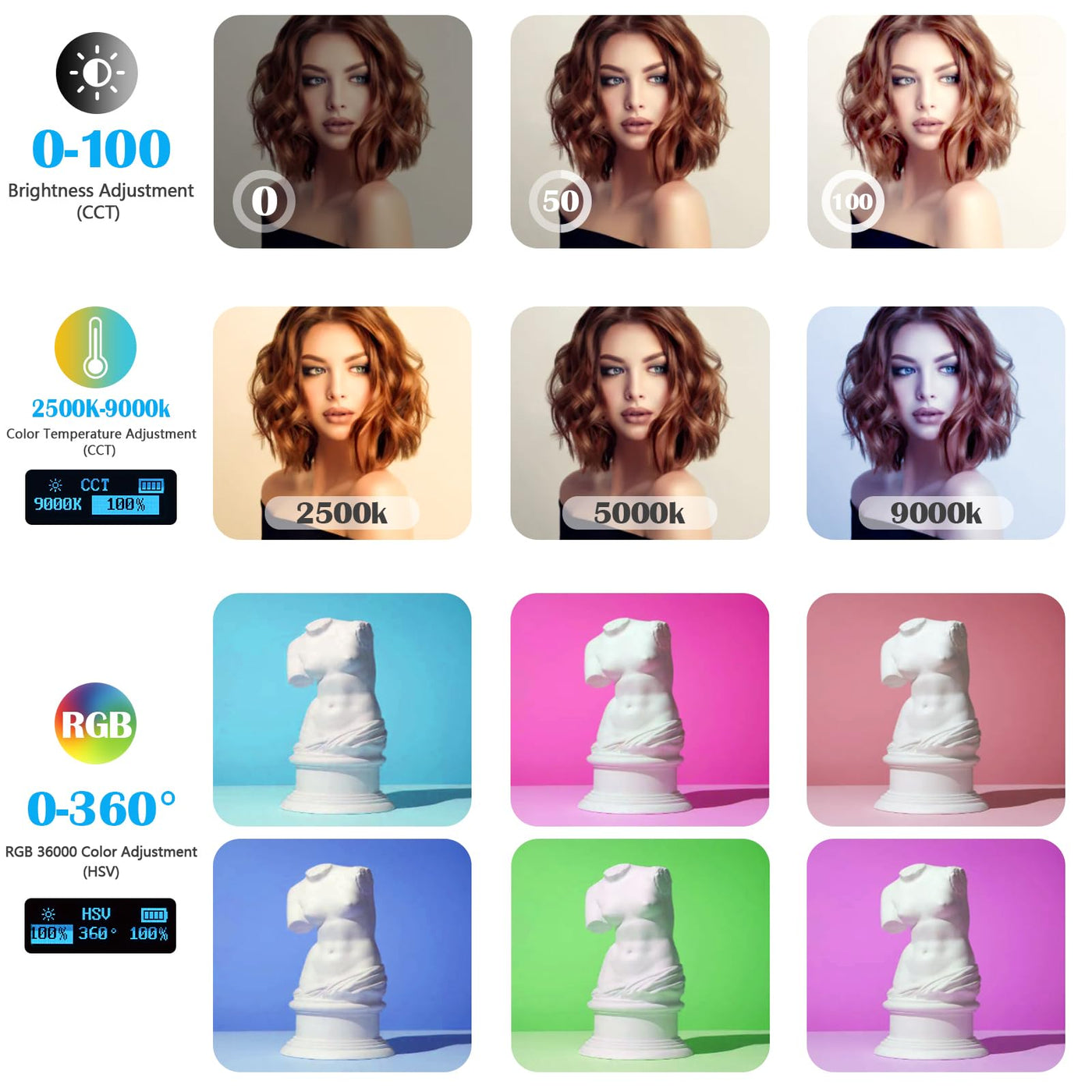 Q: What are the key features of the UTEBIT Magnetic RGB Video Light?A: The UTEBIT Magnetic RGB Video Light features 61 LEDs, including 35 high-quality white LEDs and 36 RGB LEDs, with adjustable brightness from 0-100 and color temperature settings ranging from 2500K to 9000K. It offers three light modes (CCT, HSV, FX), 20 different scene modes for creative lighting, and a built-in 2000mAh rechargeable battery for extended use.
