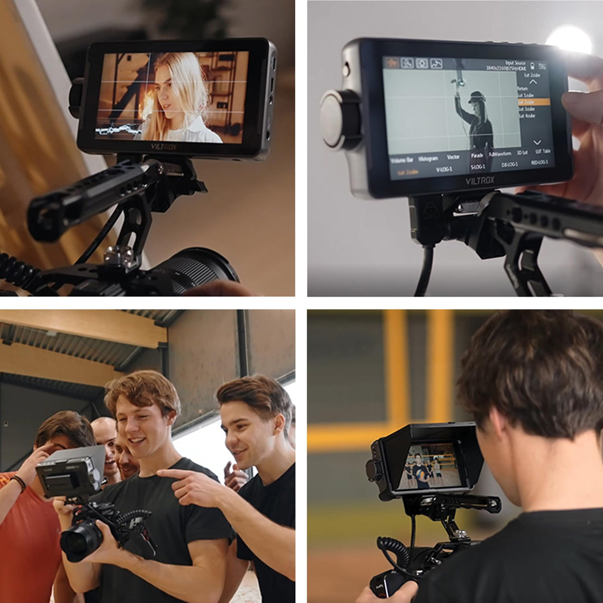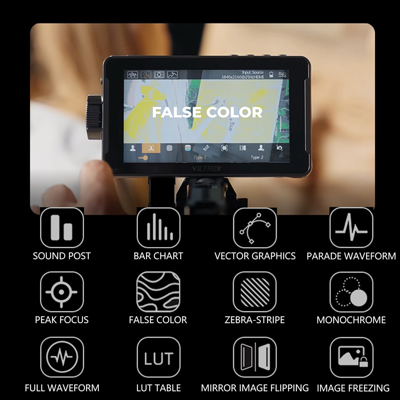 Q: What are the key features of the VILTROX DC-550PRO monitor?A: Key features of the VILTROX DC-550PRO include a 4K HDMI input/output, gyroscope functions for automatic image flipping, false color function for precise exposure control, and the ability to load 3D LUT files for enhanced color display.