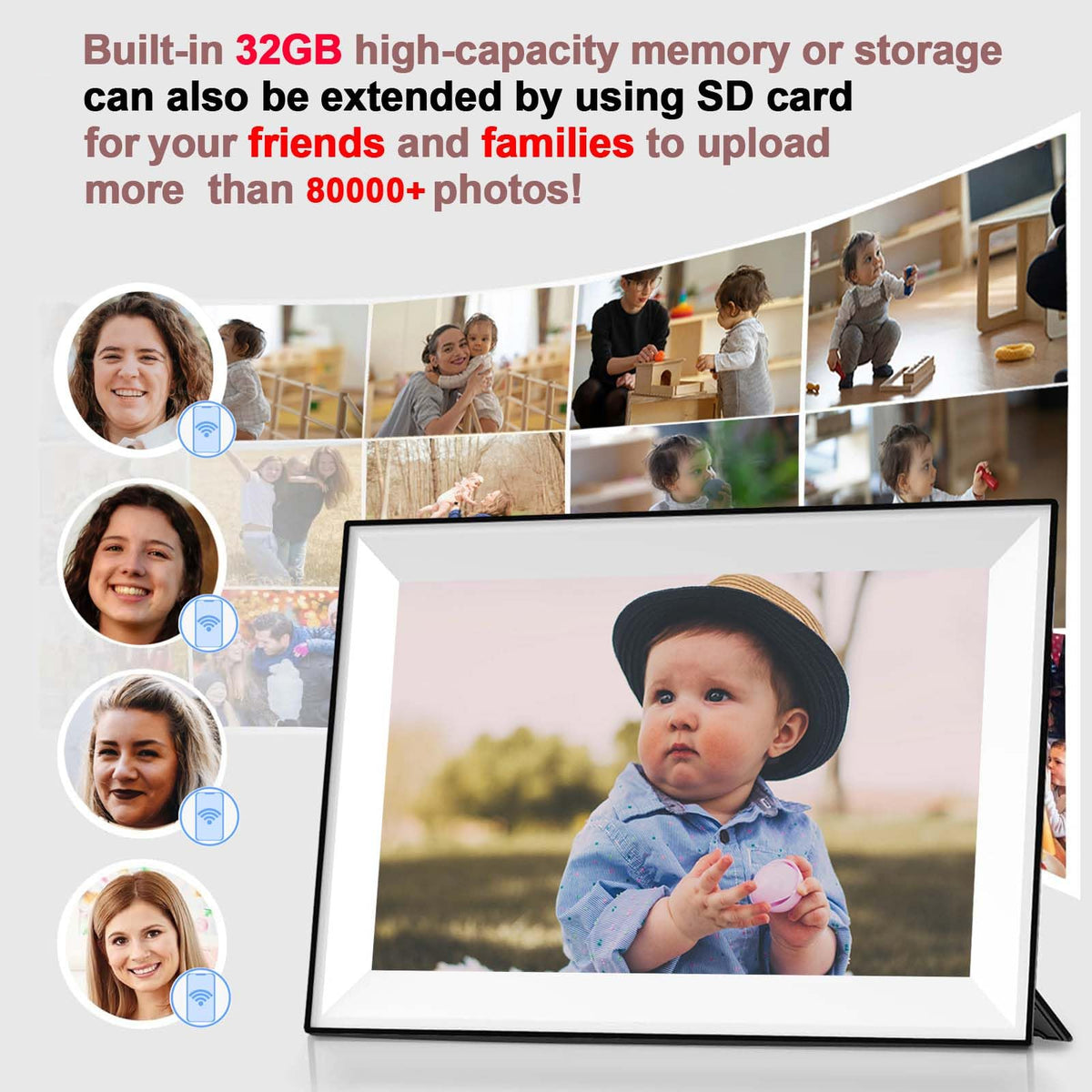 Q: What memory capacity does the Yunpkture digital picture frame have?A: The Yunpkture Digital Picture Frame comes with built-in 32GB memory, allowing you to upload and store more than 80,000 photos, making it easy to display your favorite memories.