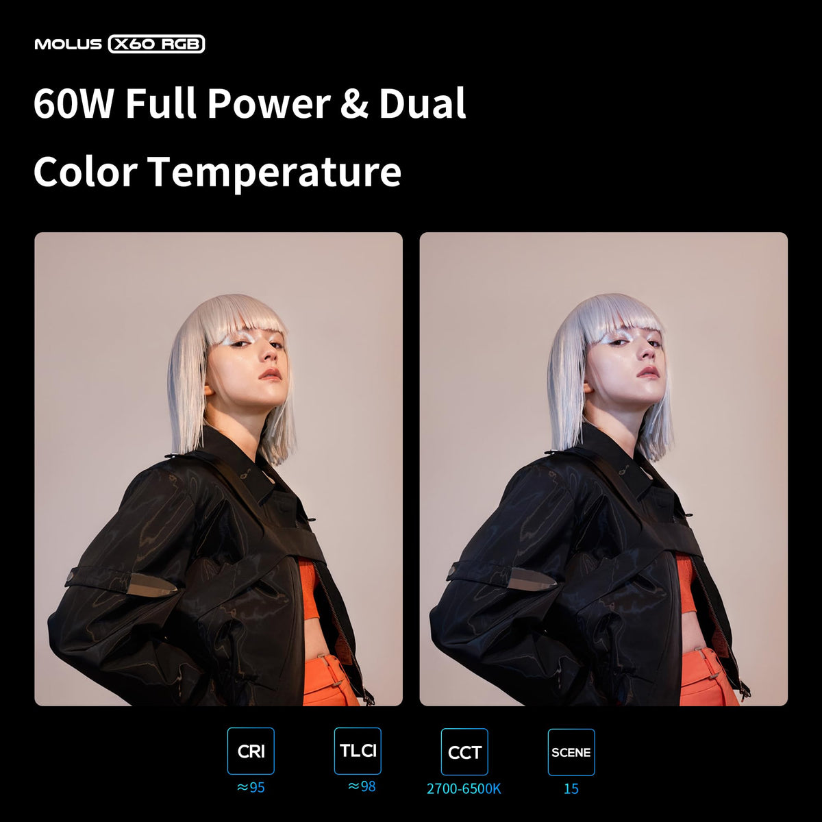 Q: What is the color temperature range of the ZHIYUN Molus X60?A: The Molus X60 offers a color temperature range from 2700K to 6500K, enabling users to adjust the lighting to suit various shooting conditions and creative preferences.