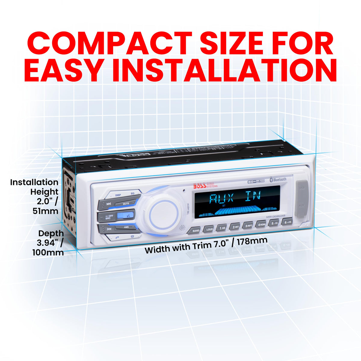Rock The Waves With The Boss Audio Mr1308Uab Weatherproof Single-Din Digital Media Player In A White Finish. Listen To Local Am/Fm Radio Stations, Hook Up Your Smartphone Or Mp3 Player Through The Auxiliary Input Or Plug Into The Usb And Sd Ports To Surf Your Tunes. Bluetooth Technology Lets You Stream Audio Apps Like Pandrora And Spotify And Make Calls Hands-Free. The Front Panel Detaches For Peace Of Mind And Easy Storage. State-Of-The-Art Weatherproofing Materials And Special Uv Protection Coatings Provide Resistance To Corrosion And Protection From The Elements. Pull Up Anchor And Set Sail To Great Music With The Boss Mr1308Uab. For Further Product Details, Please Scroll Down.