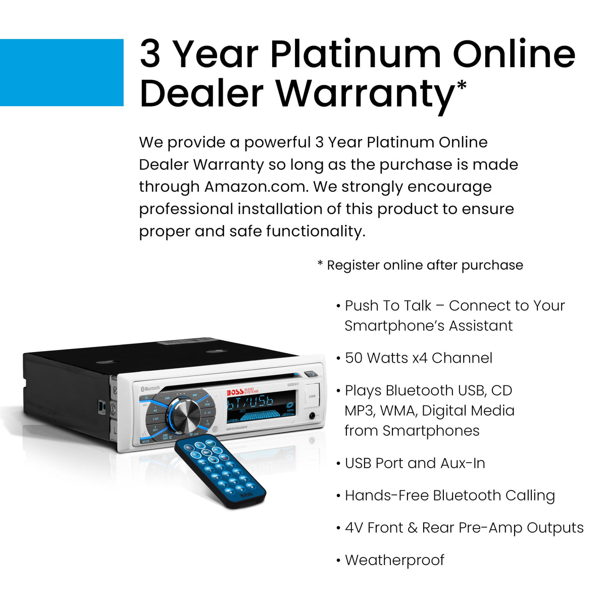 Get Your Boat Rocking With The Boss Audio Mr508Uabw White Weatherproof Cd Player. Listen To Your Favorite Cd, Catch The Latest Tunes On The Am/Fm Radio, Or Hook Your Smartphone Or Mp3 Player Up Through The Auxiliary Input. For More Musical Options Plug Into The Usb Port And Ride The Waves While Listening To Your Own Tunes. A Wireless Remote Keeps You In Control Of All Your Options. Bluetooth Technology Lets You Play And Control Your Favorite Music Apps Like Spotify And Pandora And Make Calls Hands-Free. State-Of-The-Art Weatherproofing Materials And Special Uv Protection Coatings Provide Resistance To Corrosion And Protection From The Elements. Leave The Dock To The Sounds Of The Boss Audio Mr508Uabw.
