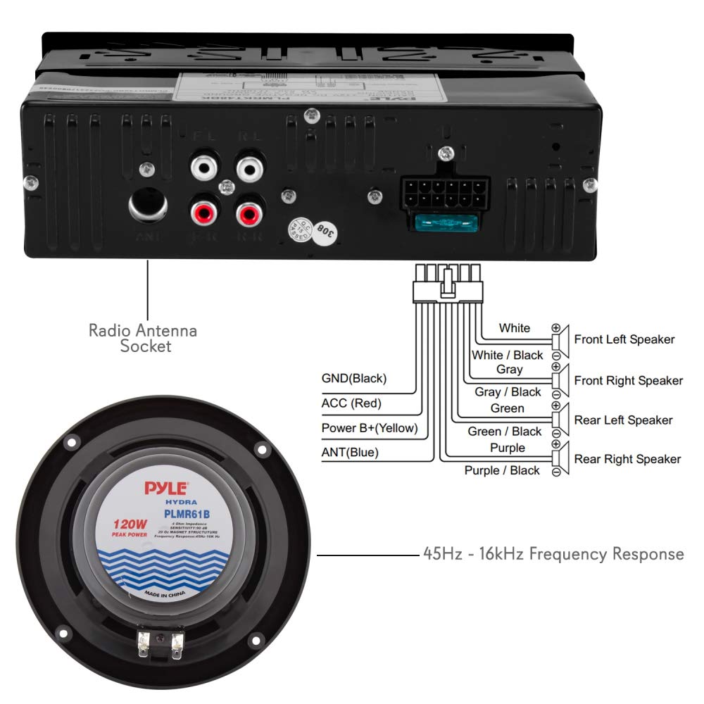 Pyle Model: Plmrkt48Bkpyle Bluetooth Marine Stereo Receiver & Speaker Kit Amfm Radio Headunit With Wireless Streaming Hands-Free Calling Ability (4) Waterproof 65 Speakers Mp3Usbsdaux Single Din 4 X 75 Wattsystem Features: Kit Includes Receiver + (4) Marine Speakers + Accessories In-Dash Console Marine Stereo System Digital Amfm Radio Tuner Bluetooth Wireless Music Streaming Built-In Microphone For Hands-Free Talking Usb Flash Drive & Micro Sd Memory Card Readers Aux (35Mm) Input Connector Jack Ability To Connect Additional External Devices (Smartphones, Mp3 Players, Tablets) Rear Rca (Lr) Output Connector Jacks Illuminated Button Controls Lcd Digital Display Panel Id3 Tag Song Readout Information: Name, Title & Artist Bass, Treble, Balance, Fader Adjustment Repeatrandom Music Functions Eq Audio Configuration Used For Automobile, Off-Road, Boat & Marine Watercraftbluetooth Receiver Connectivity: Built-In Bluetooth Wireless Music Streaming Receiver Integrated Front Panel Microphone For Hands-Free Calling Compatible With All Of Your Favorite Bluetooth Devices (Iphone, Androids, Smartphones, Ipad, Tablets, Etc) Bluetooth Version: 20 Bluetooth Network Name: Apylea Wireless Range: 25A+ Ftwhatas In The Box: Bluetooth Marine Receiver (4) 65Aa -Inch Marine Grade Speakers Speaker Connection Wire Power & Wiring Harness Metal Chassis Frame Bracket Outer Trim Frame Cover Remote Controlspeaker Features: Includes (4) Component Speakers Marine Grade Waterproof Construction Full Range Stereo Sound Reproduction 2-Way Dual Cone Speakers Polypropylene Cone, Cloth Surround Molded Abs Machined Basket And Grill For Marine, Automobile & Off-Road Vehicles Universal Standard Oem Replacement Size Includes Speaker Wire & Mounting Hardware Max Power: 120 Watt, Rms: 60 Watt 4 Ohm Impedance 20 Oz Circuit Magnet Voice Coil: 10, Aluminum Frequency Response: 45Hz - 16Khz Speaker Cut-Out Diameter: 53Aa Speaker Mounting Depth: 25Aareceiver Technical Specs: Single Din Universal Standard Size Receiver Max Power: 300 Watt (75W X 4) Bluetooth Support: A2Dp, Avrcp, Hsp, Hfp Mpxpll Tuning Radio System Sn Ratio: >60Db Tone Controls: +-10Db Stereo Separation: >45Db Receiver Current Drain: 15 Amp Digital Audio File Support: Mp3, Wma Maximum Usbmicro Sd Support Size: 32Gb Frequency Response: 20-20Khz Power: Dc 12V Receiver Chassis Dimensions: 178(W) X 108(D) X 50(H) Mmthe Pyle Bluetooth Marine Stereo Kit Includes A Radio Receiver And (4) Waterproof Marine Grade Speakers The Kits Single Din Universal Standard Headunit Comes Loaded With Features Like Built-In Bluetooth, Amfm Radio With 30 Presets, Usb Flash Drive Reader, Micro Sd Memory Card Reader -- Along With An Aux (35Mm) Input Jack You Will Have The Ability To Connect And Stream Audio From All Of Todays Latest Devices (Like Smartphones, Tablets And Mp3 Players) Bluetooth Allows For Easy Wireless Music Streaming And Hands-Free Talking Ability -- Thanks To The Integrated Microphone On The Receiveras Front Panel Stream Your Entire Mp3 Playlist With Digital Audio File Support, All While Having Quick Access To The Front Panel Control Center And Digital Lcd Display Screen The Four 65 -Inch Included Component Speakers Provide Full Range Stereo Sound Reproduction And Are Universal Standard Sizes For Quick Oem Speaker Replacement Upgrade Your Marine Vehicleas Sound System With The Pyle Stereo Receiver & Waterproof Speaker Kit