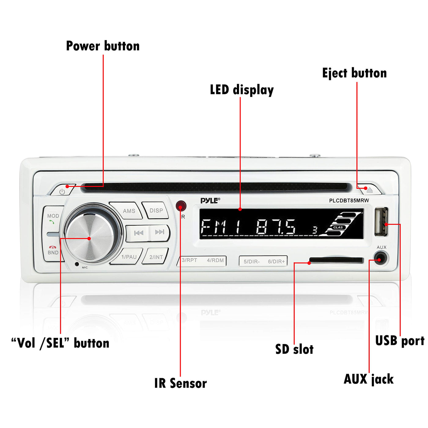 Pyle Model : Plcdbt85Mrwbluetooth Marine Stereo & Speaker Kitbluetooth Marine Stereo Radio Receiver & Waterproof Speaker Kit, Hands-Free Talking, Cd Player, Mp3/Usb/Sd Readers, Am/Fm Radio, (4) 6.5 Speakersmarine Kit Features: Includes Stereo Receiver, (4) Waterproof Speakers + Accessory Kit Comes With All Necessary Cables/Wiring For Installation Universal Standard Oem Sizes For Easy Sound System Upgrade Used For Boat, Marine Watercraft, Automobile & Off-Road Vehiclesheadunit Receiver: In-Dash Console Marine Stereo System Bluetooth Wireless Music Streaming Built-In Microphone For Hands-Free Talking Front Loading Cd Player Usb Flash Drive & Sd Memory Card Readers Mp3 Digital Audio File Compatibility Am/Fm Radio - 30 Station Memory Presets Aux (3.5Mm) Input Connector Jack Ability To Connect Additional External Devices (Smartphones, Mp3 Players, Tablets) Rear Rca (L/R) Output Connector Jacks Illuminated Button Controls Lcd Digital Display Panel Id3 Tag Song Readout Information: Name, Title & Artist Bass, Treble, Balance, Fader Adjustment Eq Audio Configurationbluetooth Receiver Connectivity: Built-In Bluetooth Wireless Music Streaming Receiver Integrated Front Panel Microphone For Hands-Free Calling Compatible With All Of Your Favorite Bluetooth Devices (Iphone, Androids, Smartphones, Ipad, Tablets, Etc.) Bluetooth Version: 2.0 +Edr Bluetooth Network Name: Car Bit Bluetooth Network Password: 0000 Wireless Range: 16 Ft.Marine Speakers: Includes (4) 6.5'' Component Speakers Marine Grade Waterproof Construction Full Range Stereo Sound Reproduction Dual Cone Speakers Polypropylene Cone, Cloth Surround Molded Abs Machined Basket And Grill Max Power: 150 Watt (Rms Power: 75 Watt) 4 Ohm Impedance 20 Oz. Circuit Magnet Voice Coil: 1.0'', Aluminum Frequency Response: 80Hz - 18Khz Speaker Total Diameter: 7.09'' Speaker Cut-Out Diameter: 5.31'' Speaker Mounting Depth: 2.48''What'S In The Box: Marine Stereo Receiver (4) 6.5 Waterproof Speakers Water-Resistant Radio Shield Wireless Remote Control Power & Wiring Harness Mounting Screws Speaker Cablereceiver Technical Specs: Single Din Universal Standard Size Maximum Output Power: 4 X 50 Watt Mpx/Pll Tuning Radio System Random/Repeat Audio File Functions 3 Beam Laser Tracking - 8X Oversampling Electronic Shockproof (Esp) Function Anti-Skip Mechanism, Disc Protection S/N Ratio: >55Db Tone Controls: +/-10Db Stereo Separation: >45Db Current Drain: 10 Amp Power: Dc 12V Digital Audio File Support: Mp3, Wma Multimedia Disc Compatibility: Cd, Cd-R, Cd-Rwthe Pyle Marine Stereo Receiver & Waterproof Speaker Kit Is Perfect For All Boat And Watercraft Applications. It Serves Perfectly To Replace An Existing Audio System Or Can Be Setup As A New Application Digital Stereo System Upgrade -- Thanks To Universal Mounting Ability. The Included Single Din Universal Standard Headunit And 6.5 -Inch Marine Speakers Were Designed With Oem Parts In Mind, So Installation Will Be Quick And Hassle-Free. Headunit Features Include Bluetooth Wireless Music Streaming Ability, Built-In Microphone For Hands-Free Talking, Am/Fm Radio With 30 Station Memory, Usb Flash & Sd Memory Card Readers, Mp3 Digital Audio Support -- Along With An Aux (3.5Mm) Input Jack To Connect And Stream Audio From Even More External Devices. Control It All Via The Digital Lcd Display Screen Or Use The Included Remote Control. The System Also Includes A Water-Resistant Radio Shield Face Cover For All Season Weather-Resistant Protection. Add Marine Grade And Weatherproof Sound To Your Surroundings With The Pyle Bluetooth Marine Receiver & Waterproof Speaker Kit.
