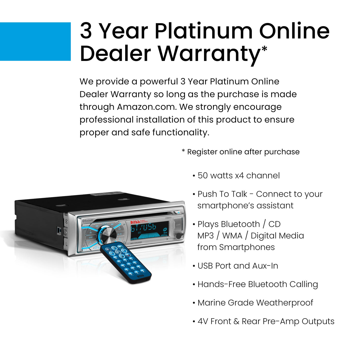 Q: Does the Boss Audio MR508UABS come with a warranty?A: Yes, Boss Audio Systems provides a 3-year platinum online dealer warranty for purchases made through Amazon.com, ensuring peace of mind for buyers.