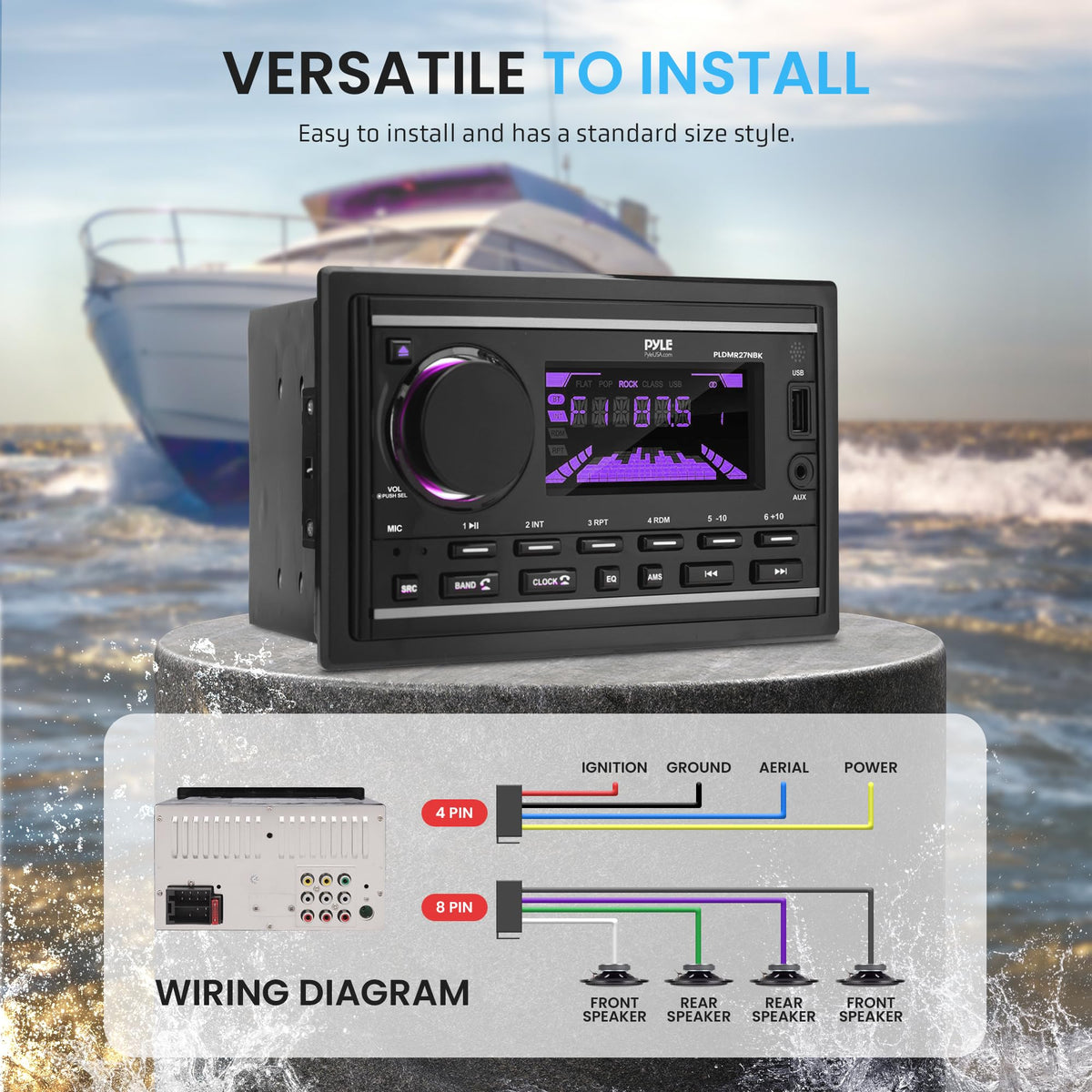 Pyle Double Din Marine Bluetooth Receiver Stereo - Am/Fm/Mp3/Usb/Aux 12V Power Amplifier With 30 Preset Memory Stations, Lcd Dis