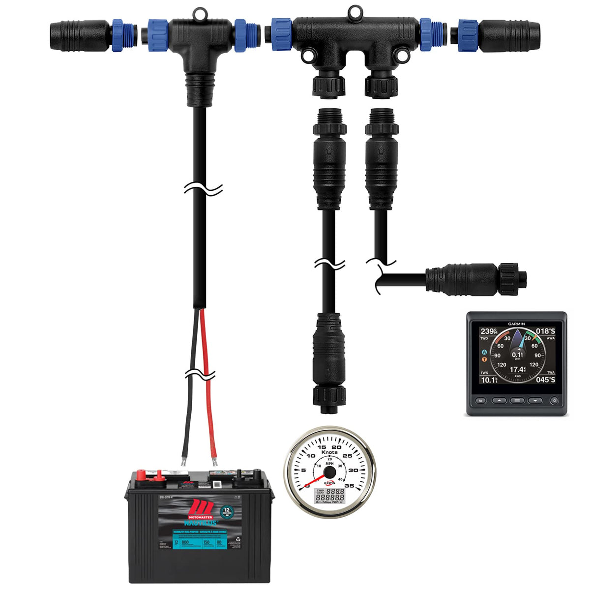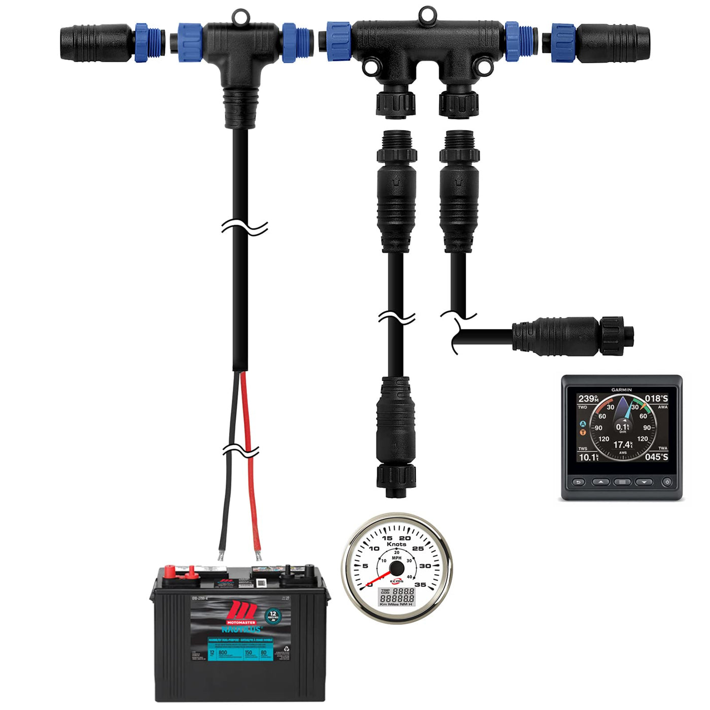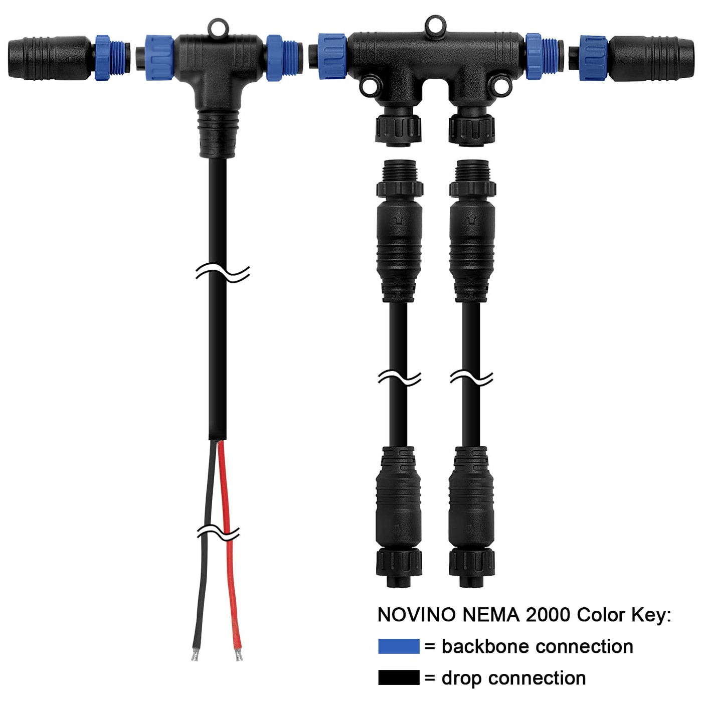 Marine Grade Nmea 2000 Backbone Cables Drop Cables Tees Terminators Starter Kit Nema 2000 Power Cable 1 Meter(3.3 Ft) With Tee---1Pcs Nema 2000 Drop Cable 2 Meter(6.5Ft)---2Pcs Nema 2000 Pair Male/Female Terminators----1 Each Nema 2000 Dual Tee Connector----1Pcs Good Quality Cable With Thicker Insulation And Simple Color Coding To Identify Backbone From Drop Cables Easy. Red=Power Connection,Blue=Backbone Connection It Is A Universal Marine Grade Nmea 2000 Cable. A Necessary Nema 2K Starter Kits Include All Components Needed To Build A New Nmea 2000 Network A Perfect Solution For The Marine Nmea 2000 Network Set Up To Add Devices(Engine Data/Outboard Motor/Fusion Radio/ Gps/Radar/ Chartplotter/Transducer) From Yamaha&Honda To Garmin Depth Finder& Lowrance Hds Live And Ghost