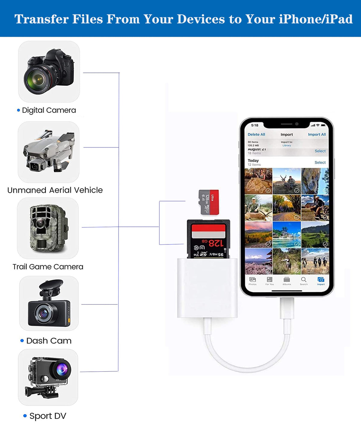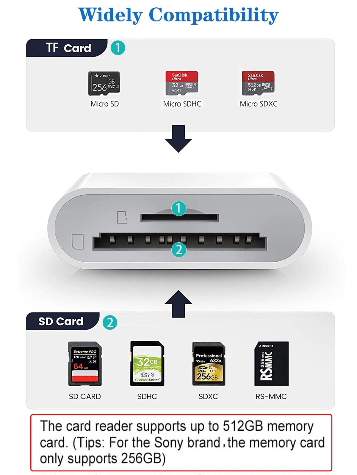 Features 1. High-Speed Transmission: Sd Card Reader For Iphone Data Transmission Speed Can Reach 20Mb/S~30Mb/S 2. Maximum Support Capacity: 512Gb 3. Support Formats: Supports Standard Photo Formats (Including Jper And Raw) And Sd And Hd Video Formats (Including H.264 And Mpeg-4). 4. Compatible Ios Devices: Compatible With Iphone 13 Pro Max, 13 Pro, 13, 13 Mini, 12 Pro Max, 12 Pro, 12, 12 Mini, 11 Pro Max, 11 Pro, 11, Xs Max, Xs, X, 8 Plus, 8, 7 Plus, 7, Se, Se 2, 6S Plus, 6 Plus, 6S, 6, 5S, 5C, 5; Compatible With Ipad Mini, Mini 2, Mini 3, Mini 4, Air, Air 2, Ipad Pro (9.7-Inch), Ipad Pro (12.9-Inch) (Usb C Ipad Pro Not Compatible) Support All Iphones With Ios 9.2 And Above Ios Version And Ipads With Ipados 8.0 Or Later Version. Precautions For Use: 1. For Ios 13 And Later Version: -- The Sd/Tf Card Reader Supports Two-Way Transmission. -- There Is No Pop-Up, You Can Can Find ''Import'' In The ''Files'' App Or ''Photos'' App. -- The Card Reader Is Not Limited To The Transfer Pictures And Videos, It Also Can Read And Transfer Word, Excel And Pdf Etc. 2. For Ios 9.2 ~ 12.4 --The Card Reader Only Supports One-Way Transmission From Sd/Tf To The Iphone/Ipad, And Does Not Support Two-Way Transmission. Warm Tips: -- The Iphone Sd Card Adapter Supports Sd Card And Micro Sd Card/Tf Card. However, Due To The Limitation Of Ios System, Only One Card Can Be Read At A Time. Please Do Not Read Two Cards At The Same Time. -- Please Ensure That The Memory Card Has Been Correctly Inserted Into The Card Reader. If Photos Or Videos Are Not Transmitted, Unplug The Card Reader And Memory Card And Reconnect. -- If Prompted That The Cable Or Accessories Have Not Been Authenticated, It May Be In Bad Contact, Please Pull Them Out And Insert Them Again. Package Included: 1 X Sd & Tf Card Adapter For Iphone 1 X User Manual