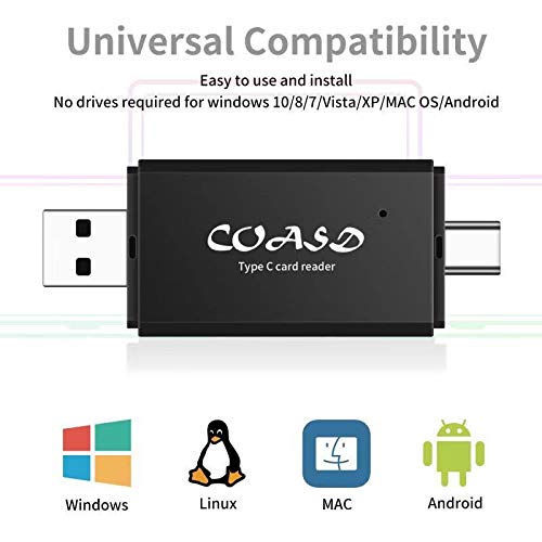 Q: Is the COASD Memory Card Reader compatible with all smartphones?A: Yes, the COASD Memory Card Reader is compatible with all tablets and Android smartphones that support the OTG function. It features both USB 3.0 Type A and Type C plugs, ensuring versatility.