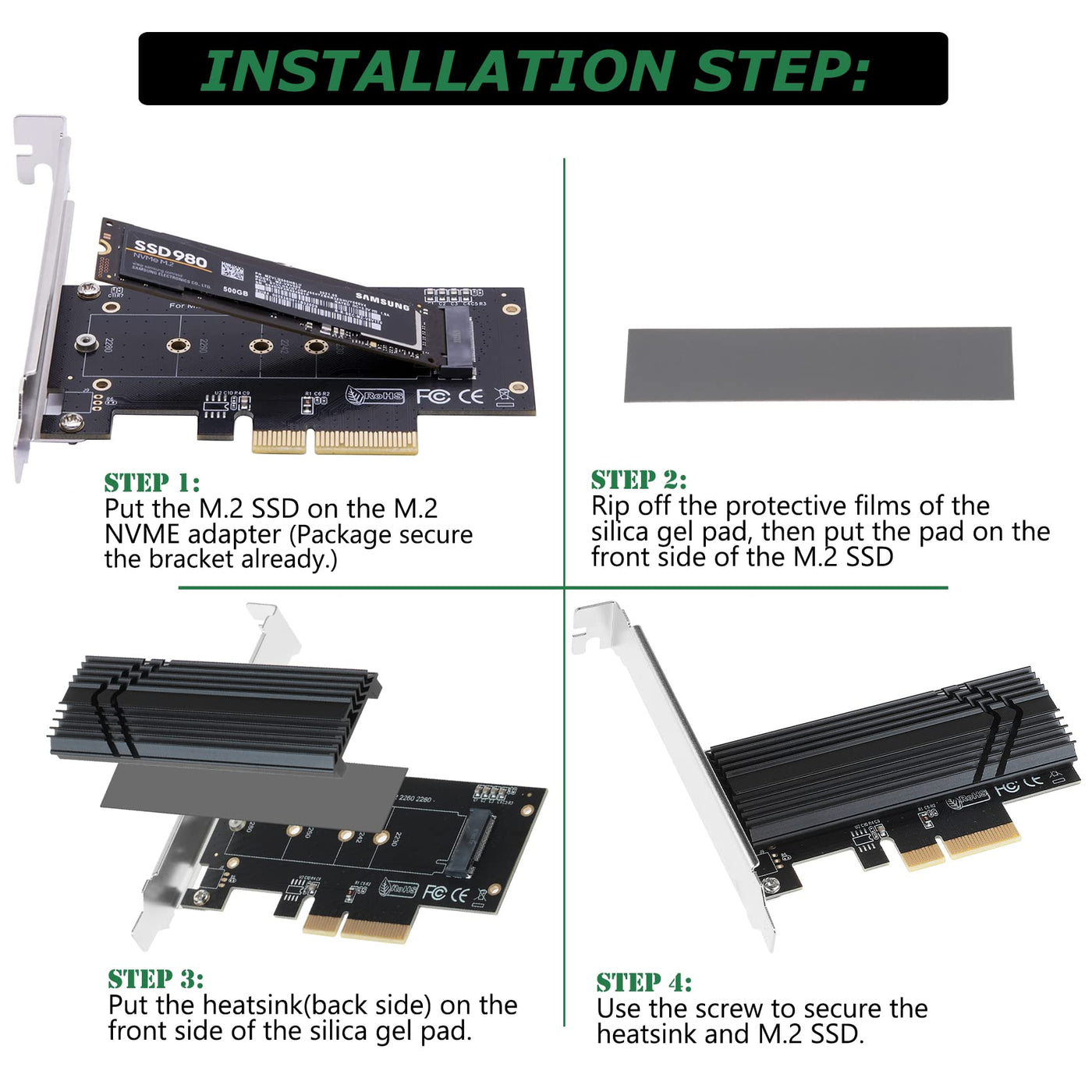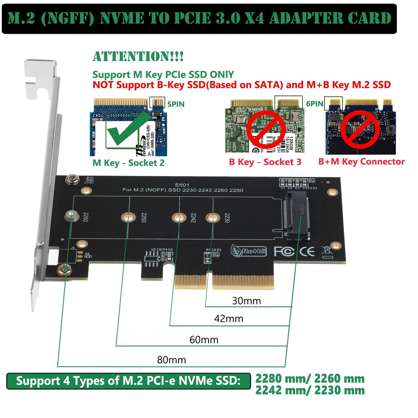 Joylifeboard M.2 Nvme Pcie To Pcie 3.0 X4 Adapter, The Latest M.2 Heatsink With The Strongest Heat Dissipation Version On The Market, Ensure The Stable Compatity. If You Have Any Questions Or Are Not Satisfied With The Items, Please Feel Free To Contact Us Service Team, We Will Definitely Solve Your Problem With 24 Hrs! Product Specifications: Model: E601 Product Name: Nvme M.2 (Ngff) Ssd Adaptern Card Product Color: As Show Heat Sink Size: 3.9/1.4 In Main Card Size:4.1/1.7 In Low Profile Bracket:3.2 In Product Packaging:Anti-Static Packaging Bag Features: ? High Performance Nvme M.2 (Ngff) Ssd Pcie Adapter Card Can Add M.2 Pci-E Nvme Ssd(M-Key)To X4 / X8 / X16 Pci-E Interface. ? Support Pcie 1.0 ,Pcie 2.0 And Pcie 3.0 (Pcie Gen1, Pcie Gen2, Pcie Gen3) Motherboard. ? Support 2280/2260/2242/2230Mm M.2 Ssd And Compatible With Windows Xp / 7 / 8 / 10 And Above And Mac Os And Linux. ? Advanced Heat Dissipation Protect Your Nvme Ssd Well And Fully Utilize The Powerful Performance Of The Hard Disk. ? No Driver Installation Required. Easy To Install, Make Precise And Close Fitting. ? Pci Express X4 Interface Design,Works On X4,X8,X16 Slot. ? Packed With Low Profile Bracket, It Is Perfect Solution For Pc Package Includes: 1 X Screwdriver 1X Low-Profile Bracket 1 X Aluminum Heatsink 1 X Nut 1X Thick Silicone Thermal Pad 7 X Screws 1 X M.2 To Pci Express Adapter Card