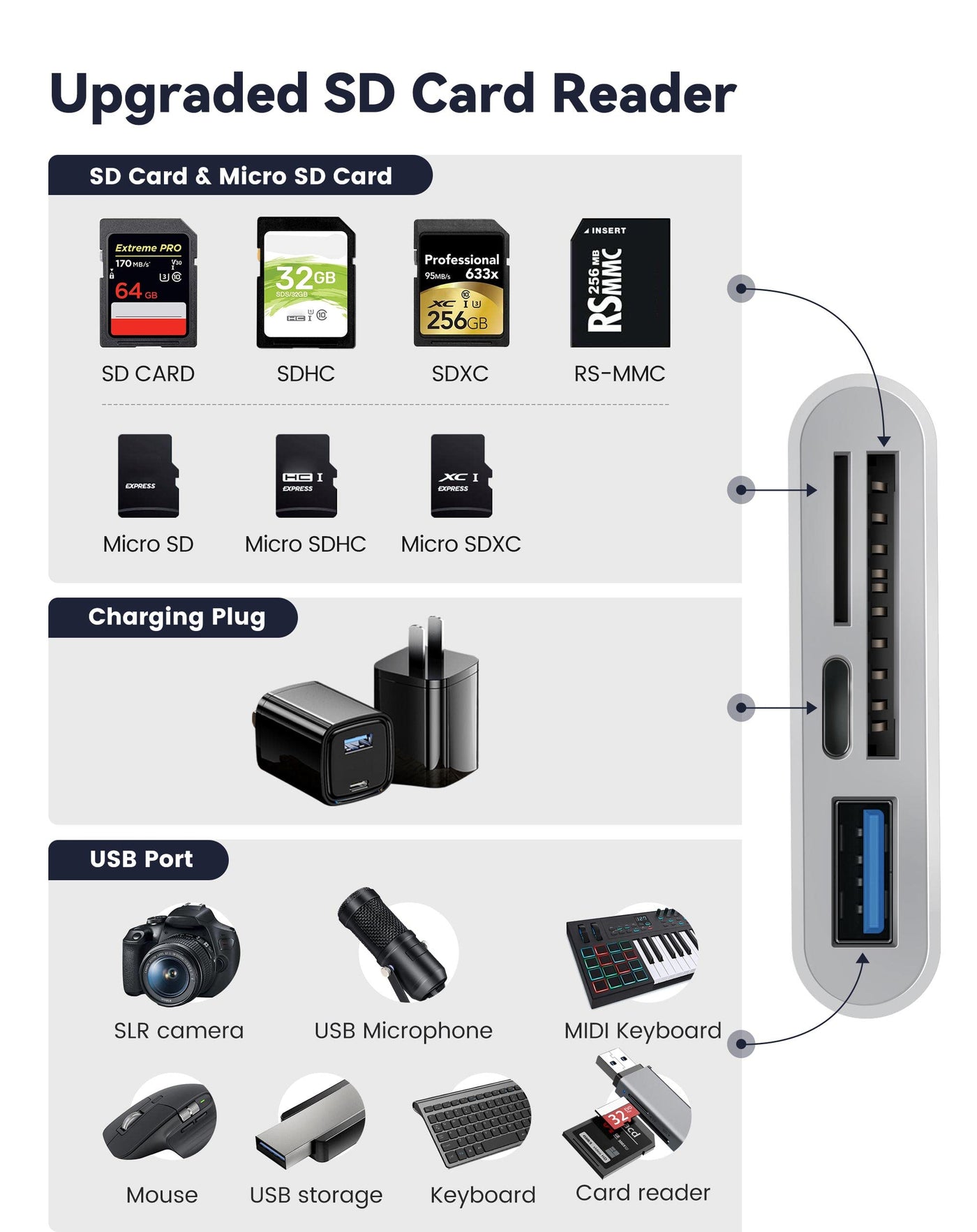 4 In 1 Iphone Sd Card Reader Compatible With Sd/Microsd Cards. Compatible With Slr Camera, Usb Microphone, Flash Drives, Midi Keyboard, Mouse, Etc. No Driver Required, Plug And Play