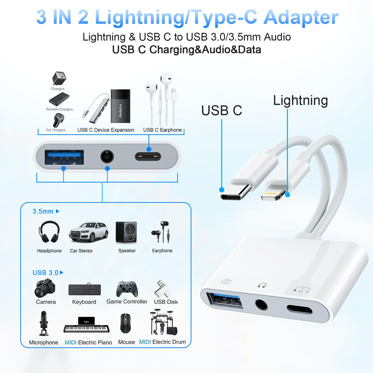 Usb C Lightning To Usb Camera Adapter With Charging Port [Mfi Certified] Usb C To Usb Otg Adapter With Usb+Usb C Charging+3.5Mm Headphone For Iphone 15/Iphone/Ipad To Usb Flash Drive Reader/Keyboard