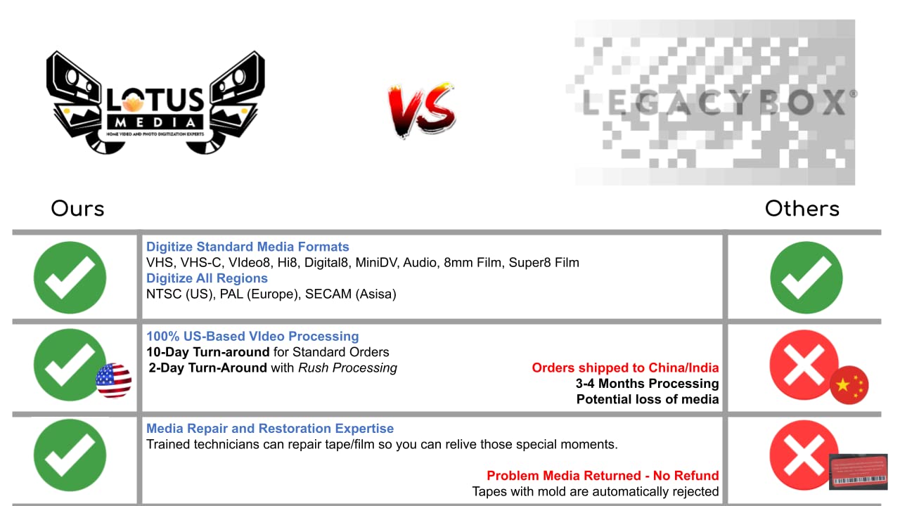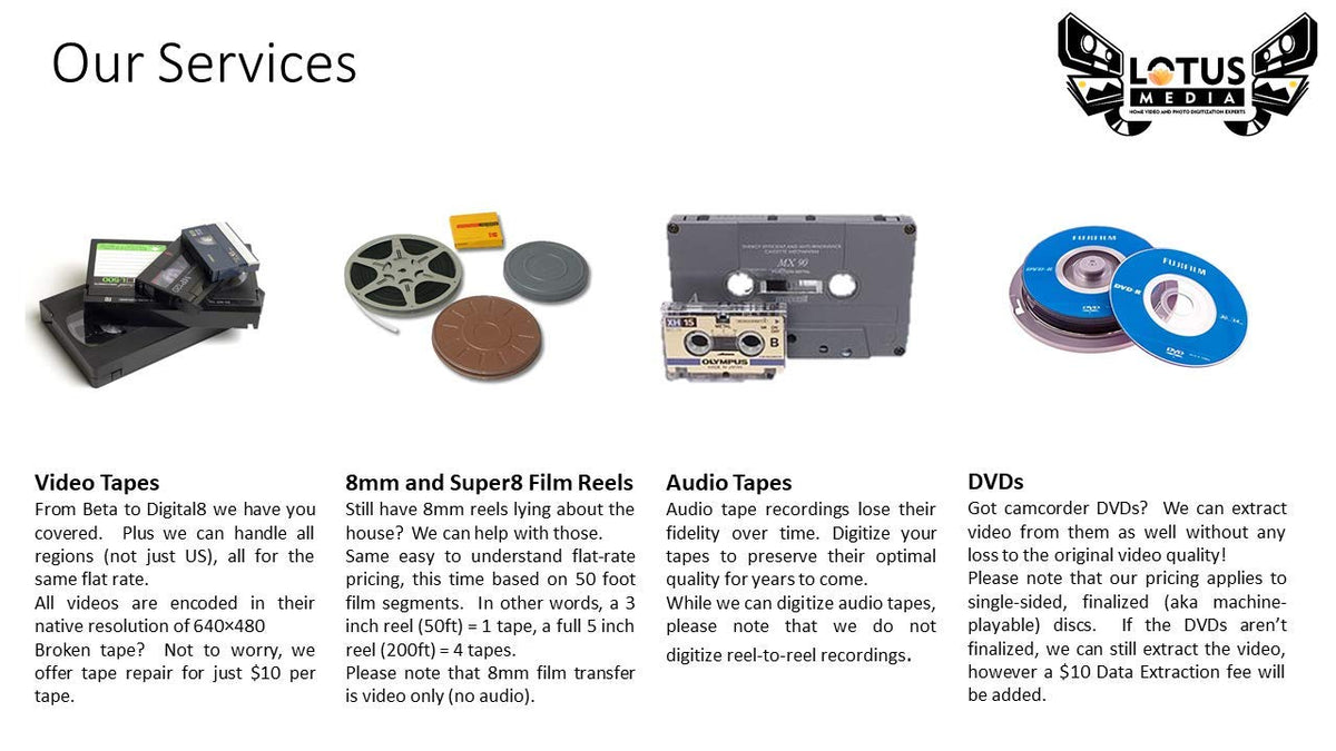 Lotus Media 10 Pack - Video Tape Transfer And Digitization To Mp4 Service (Vhs, Hi8, Minidv, Digital8, Vhs-C, Beta, Audio)
