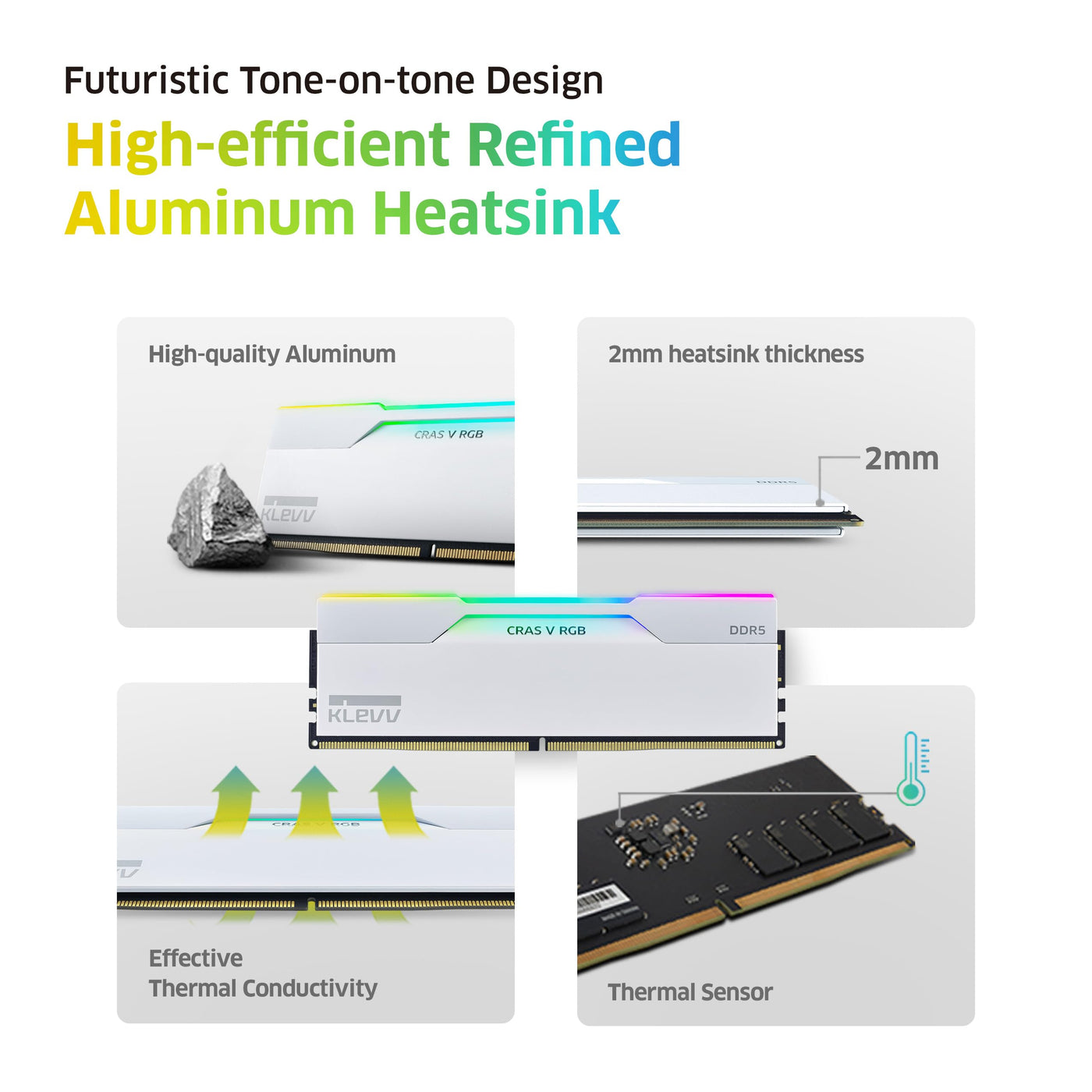 Q: What makes KLEVV CRAS V RGB DDR5 RAM suitable for gaming?A: The KLEVV CRAS V RGB DDR5 RAM is designed for high-performance gaming, offering speeds up to 8000MT/s and a low CL32 latency. Its advanced engineering, along with Intel XMP 3.0 and AMD EXPO support, ensures optimal performance for demanding games and applications.