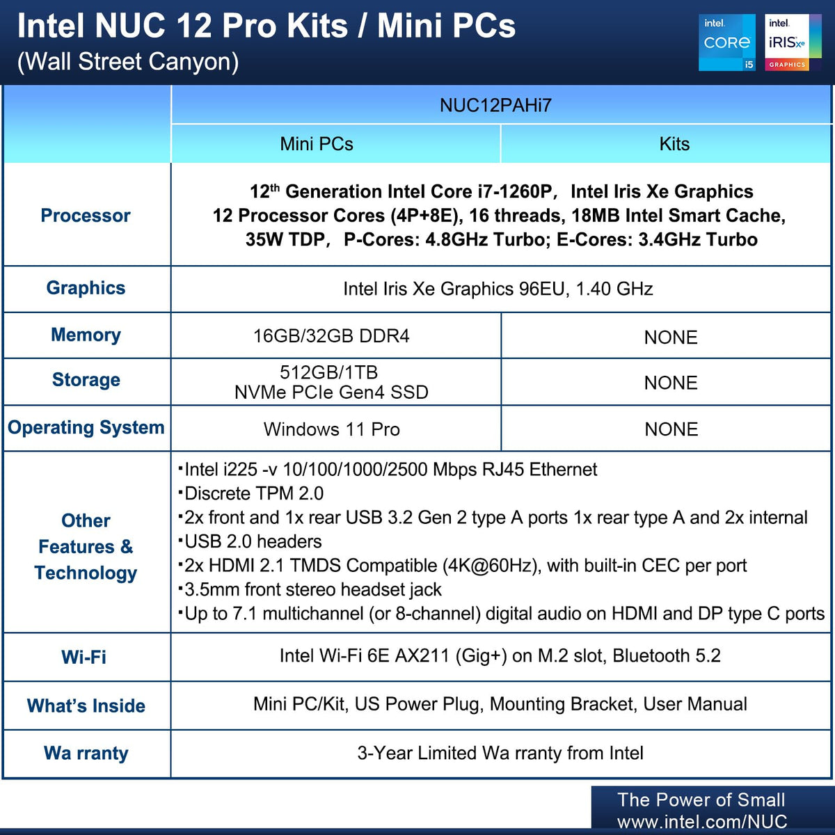 Intel Nuc 12 Nuc12Wshi7 Wall Street Canyon Mini Computer 12Th Gen Intel Core I7 1260P, 12 Cores(4P+8E), 16 Threads, 18Mb Intel S