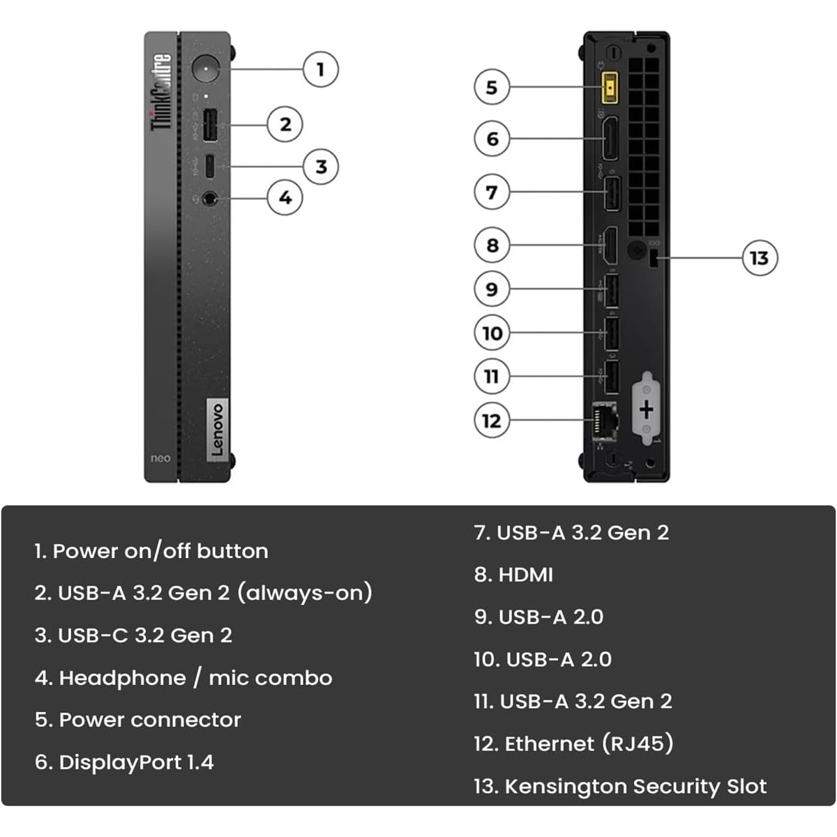 Form Factor:&Nbsp;Tiny (1L)Processor:&Nbsp;Intel Core I5-13420H, 8C (4P + 4E) / 12T, P-Core 2.1 / 4.6Ghz, E-Core 1.5 / 3.4Ghz, 12Mbgraphics:&Nbsp;Intel Uhd Graphicschipset:&Nbsp;Intel Soc Platformmemory:&Nbsp;64Gb Ddr4 Ramstorage:&Nbsp;1Tb Ssd M.2 Pcie 3.0X4 Nvmeoptical:&Nbsp;Noneaudio Chip:&Nbsp;High Definition (Hd) Audio, Realtek Alc256 Codecspeakers:&Nbsp;2Wx1Microphone:&Nbsp;No Microphonepower Supply:&Nbsp;65W 89% Adapterkeyboard:&Nbsp;Usb Calliope Keyboard, Black, Englishmouse:&Nbsp;Usb Calliope Mouse, Blackdimensions (Wxdxh):&Nbsp;179 X 182.9 X 36.5 Mm (7.05 X 7.2 X 1.44 Inches)Weight:&Nbsp;Around 1.11 Kg (2.45 Lbs)Ethernet:&Nbsp;Integrated 100/1000Mwlan + Bluetooth:&Nbsp;Intel Wi-Fi 6 Ax201, 802.11Ax 2X2 + Bt5.2Front Ports:1X Usb-C 3.2 Gen 2 (Support Data Transfer And 5V@0.9A Charging)1X Usb 3.2 Gen 2 (Always On And 5V@2.1A Charging)1X Headphone / Microphone Combo Jack (3.5Mm)Rear Ports:2X Usb 2.02X Usb 3.2 Gen 21X Hdmi 2.1 Tmds1X Displayport 1.41X Ethernet (Rj-45)Security Chip:&Nbsp;Firmware Tpm 2.0 Integrated In Socphysical Locks:&Nbsp;Kensington Security Slot, 3 X 7 Mmchassis Intrusion Switch:&Nbsp;Chassis Intrusion Switchoperating System:&Nbsp;Windows 11 Professional, English