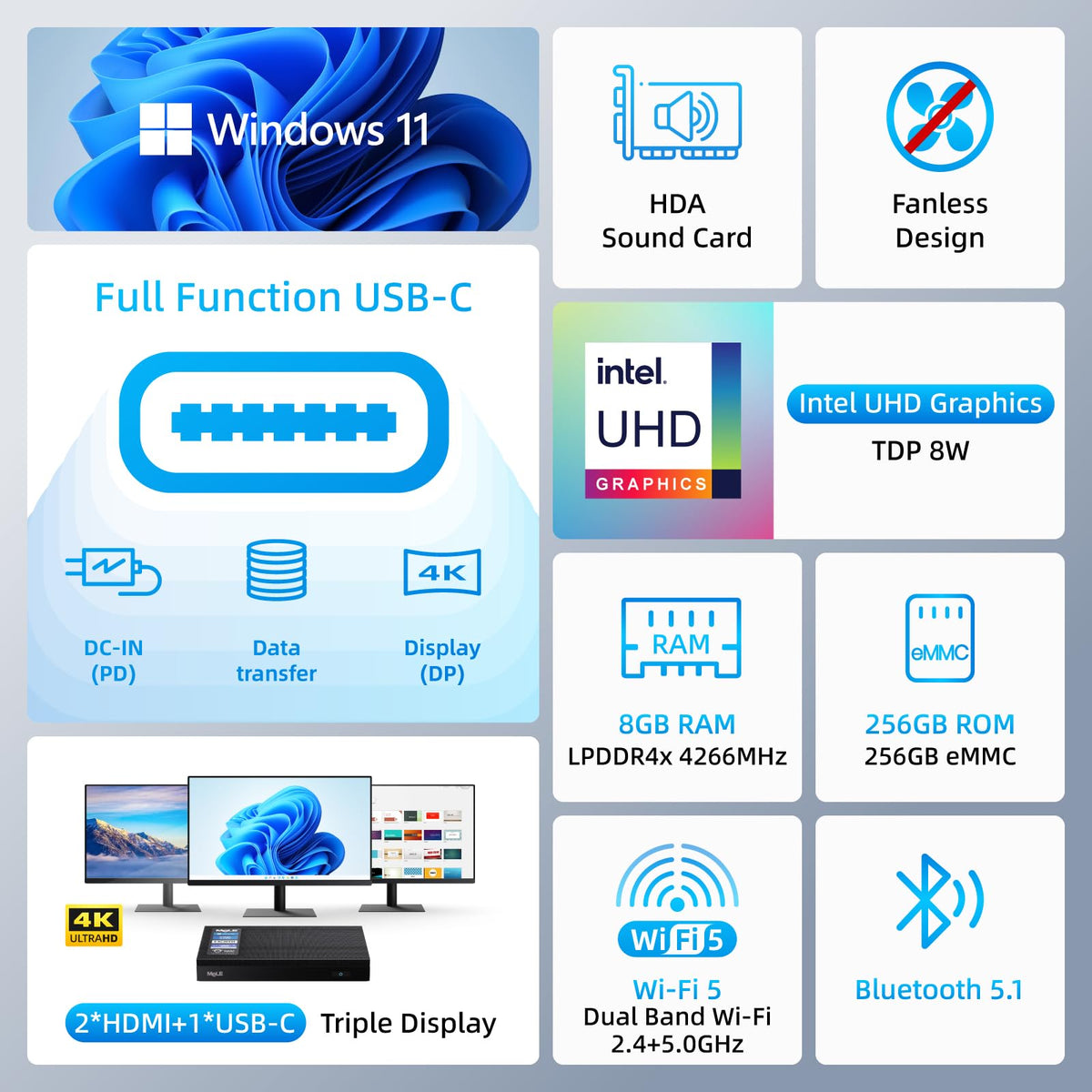 Mele Mini Pc Quieter 4C 12Th Gen N100, Fanless Pc, 8Gb Ram, 256Gb Rom, Windows 11 Pro, 2.4/5G Wi Fi, Full Functional Usb C, 4K