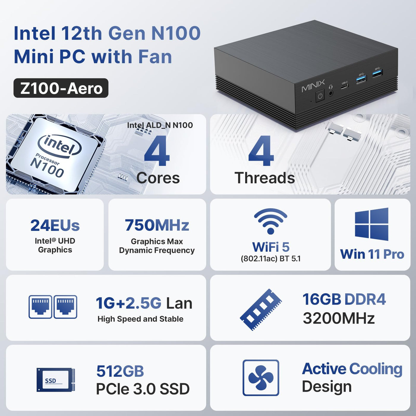 Minix Z100 Aero Mini Pc, Intel 12Th Gen N100, 16Gb Ddr4, 512Gb Pcie 3.0 X1 Nvme Ssd Windows 11 Pro Mini Pc, 4K Triple Display/1G