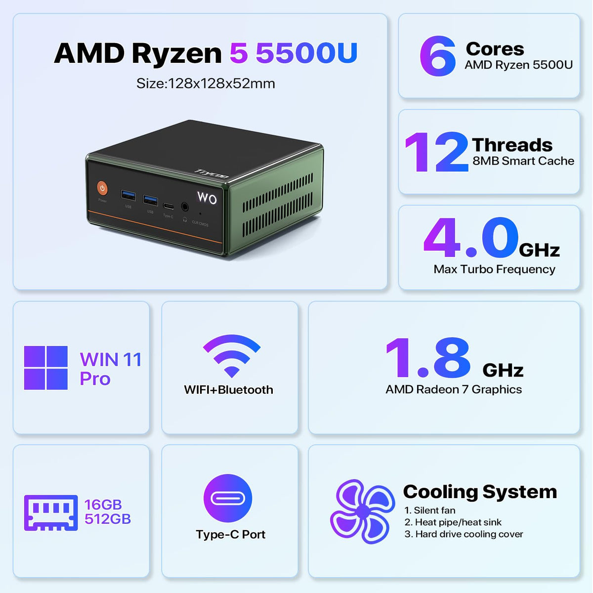Trycoo Wo4 Mini Pc, Amd Ryzen 5 5500U(4.0Ghz) Processor, 16Gb Ddr4 Ram 512Gb Ssd, Support 4K@60Hz Triple Output/Wifi6/Bt5.2/Dual