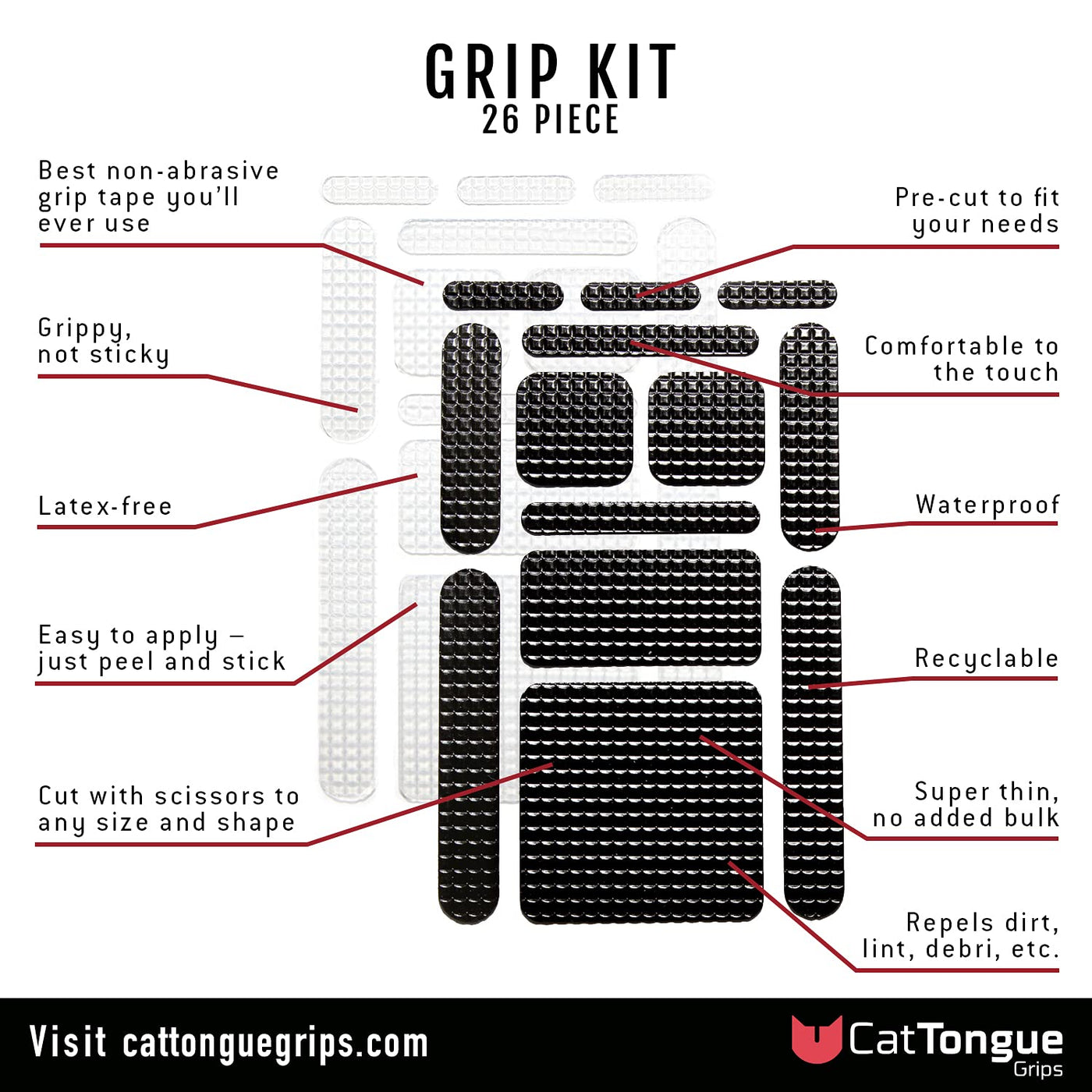 Cattongue Gription Strips Deliver The Same Performance As Our Original Grip Tape, Now In Easy-To-Use, Pre-Cut Pieces That Can Be Applied Anywhere You Need Extra Traction. Unlike Other Adhesive Strips, Gription Strips Wont Leave A Sticky Residue Or Damage Surfaces. Great To Use For Wireless Earbuds, Contact Lens Cases, Eating Utensils, Craft Supplies, Pill Bottles, Phone Chargers, Makeup Brushes, Outdoor Sporting Gear, Hearing Aids, And So Much More. Conveniently Packaged Into 26 Pre-Cut Grips, Your Grip Strips Can Be Used As-Is Or Cut To Smaller, Custom Sizes As-Needed. Made From Durable, Waterproof, And Recyclable Hdpe, Theyre Soft To The Touch Yet Tough Enough To Handle Everyday Use Indoors Or Out. Just Peel, Stick, And Enjoy Slip-Free Protection. If Youre Not Happy With Its Performance, Let Us Know And Well Make It Right!