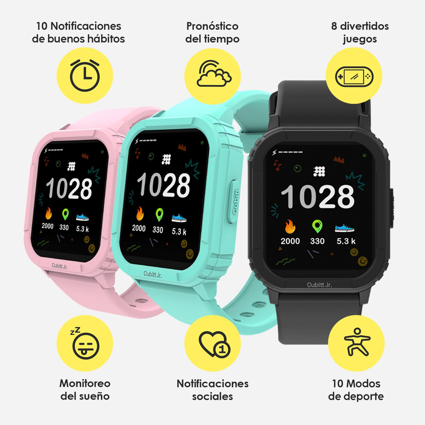 Cubitt Jr Smartwatch / Fitness Tracker , 1.52 Touch Screen, Is The Perfect Tech For Kids. Its Kid Friendly Device With Many Functions And An Attractive Look. It Has All Functions Of A Fitness Tracker (Measures Calories, Steps, Distance, Heart Rate) With Different Sport Modes, 8 Fun Games To Practice Brain Intelligence, 10 Daily Alarms For Good Habits (Breakfast, Homework, Go To School, Go To Bed, Etc), Parents Can Set Lock For Watch With Password, Receive Call Notifications, Text, Whatsapp And Social Media. Incoming Calls Can Be Alerted Via Vibration Reminders, With The Option To Hang Up. Automatically Monitors Your Daily Heart Rate And Monitors Your Sleep, Knowing Your Hours Of Rest. Our App Allows You To Review Graphs That Analyze How Deep Or Light Is Your Sleep And Your Wake-Up Times. Battery Lasts Around 7 Days, And Its Waterproof Ip68! In Summary The Best Gift And Accesory For Kids And Teens. There Is No Other Smartwatch Like This In The Market.