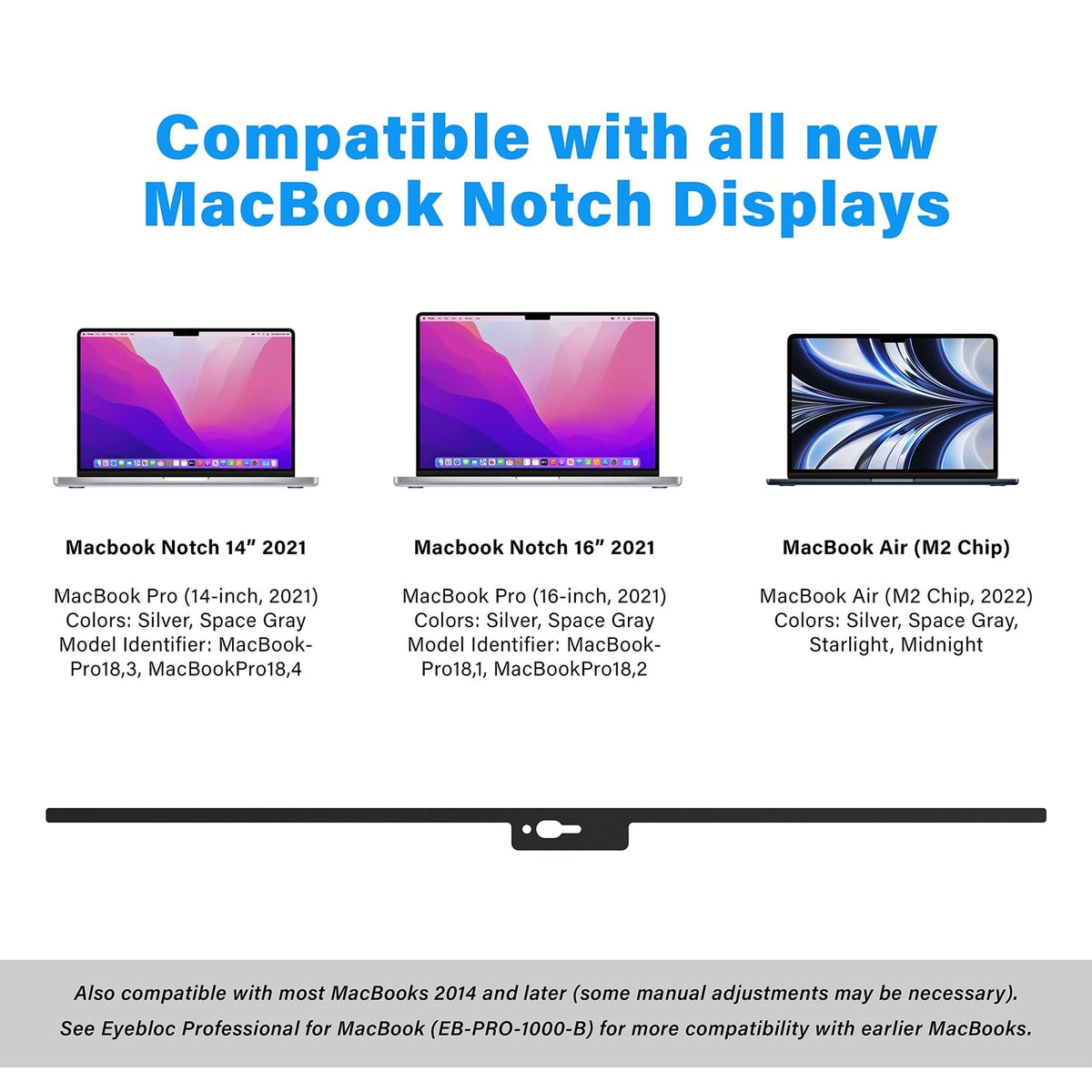 Eyebloc Webcam Cover For Macbook Notch Series 2022. Designed For All 2021/2022 Macbook Air & Macbook Pro Notch Displays. * Also Compatible With Most Macbook Models 2014-2021, Manual Adjustments May Be Necessary. Also See - Eyebloc Professional Webcam Cover For Macbook (Eb-Pro-1000-B) For Compatibility With Older Macbooks. Technical Info Length 9.06'' (230Mm) X Height .39'' (9.80Mm) X Depth .01'' (.2Mm) Weight .40Oz (12.6G)