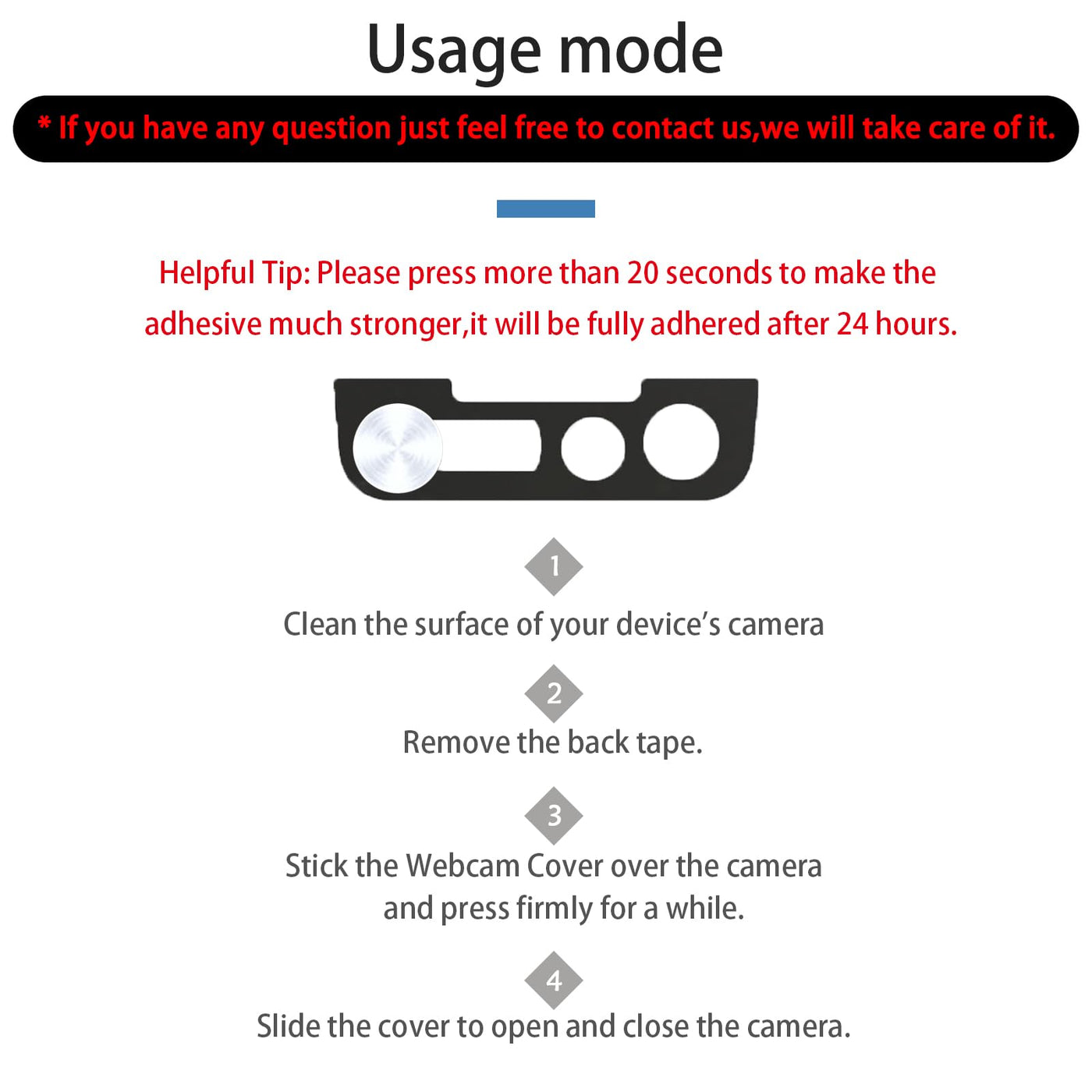 Q: How do I install the webcam cover?A: Installation is simple: just remove the back tape, align the camera cover over the front camera, press firmly for more than 20 seconds, and it’s ready to use. Ensure the surface is clean before applying.