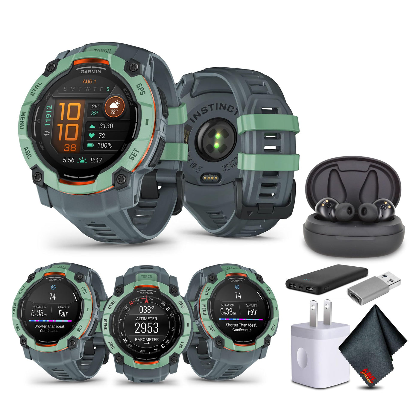 The Garmin Instinct 3 Is Built For Those Who Demand Performance And Durability In The Most Extreme Environments. Its Rugged 50 Mm Fiber-Reinforced Polymer Case And Metal-Reinforced Bezel Withstand Tough Conditions, While The Vivid 1.3 Amoled Display Offers Crystal-Clear Visibility In Any Light. With Up To 18 Days Of Battery Life, This Gps Smartwatch Is Designed To Keep Up With Your Adventures, Providing Uninterrupted Access To Essential Features. Stay Prepared For The Unexpected With A Built-In Led Flashlight Featuring Variable Intensities And Strobe Modes, Perfect For Nighttime Navigation Or Emergency Situations. Monitor Your Health And Fitness With Advanced Tools, Including Wrist-Based Tracking, And Technology ( Availability May Vary By Country). Navigate Confidently Using The 3-Axis Compass, Barometric Altimeter, And Multi-Band Gps Powered By Satiq Technology, Which Ensures Precise Positioning While Optimizing Battery Usage. Whether Hiking Rugged Trails, Exploring Off-Grid Terrain, Or Managing Daily Health, The Instinct 3 Is The Ultimate Companion For Your Outdoor Lifestyle.Bundle Items Include:Garmin Instinct 3 50Mm, Amoled Display, Rugged Outdoor Gps Smartwatch, Metal-Reinforced Bezel, Built-In Flashlight, Up To 18 Days Of Battery Life, Neo Tropic/Twilightusb Type-A To Type-C Female Adapter Converterusb Wall Charger (White Cube)6Ave Microfiber Cleaning Clothp-Bank Batteryair Pro Tws Truly Wireless Earbuds - (Color May Vary)