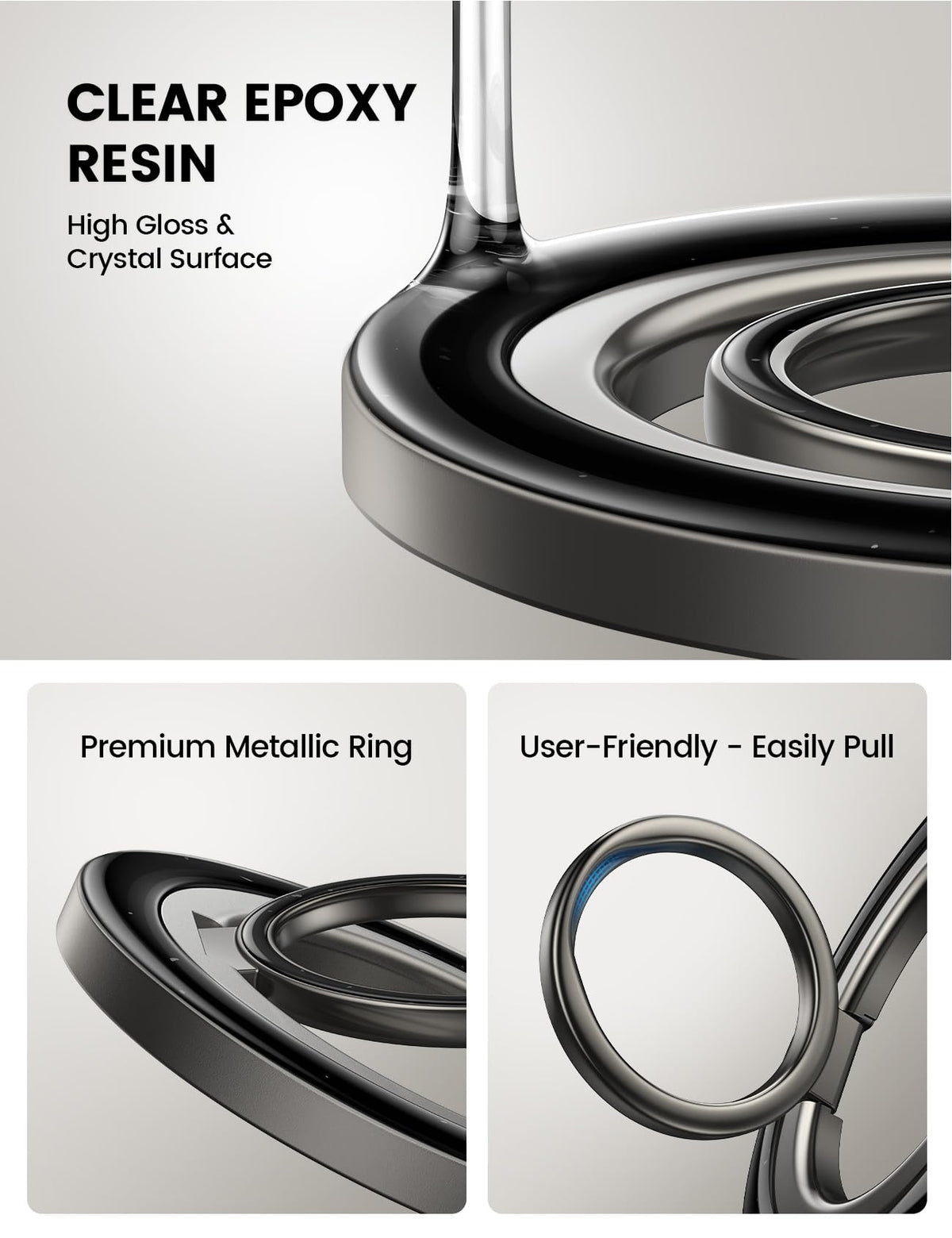Q: What materials are used in the Lamicall Magnetic Phone Ring Grip?A: The Lamicall Magnetic Phone Ring Grip features a premium metal construction that is sealed with transparent resin, giving it a stylish appearance. The grip also incorporates a strong magnet that provides secure attachment to your device, ensuring both durability and functionality.