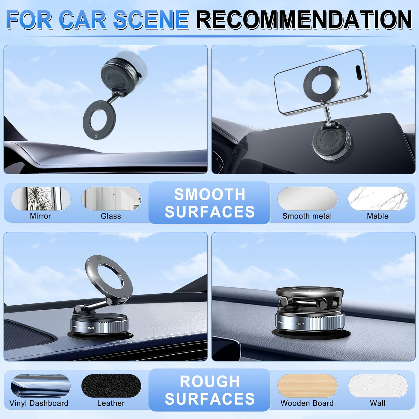 Product Name: Livtee Vacuum Magnetic Phone Holder Compatible Devices: Fits Iphone 16 / 15 / 14 / 13 / 12 Series (Magsafe Compatible) Other Smartphones Require A Metal Ring Key Features: Tool-Free, Glue-Free Installation - Wont Damage Your Cars Interior Built-In 24X N55 Magnets - Ultra-Strong Hold, Even On Bumpy Roads 360 Rotation - Easy Horizontal/Vertical Viewing For Driver Or Passenger Package Includes: Phone Mount 1 Metal Ring 1 Pc Pad 1 Product Manuals 1