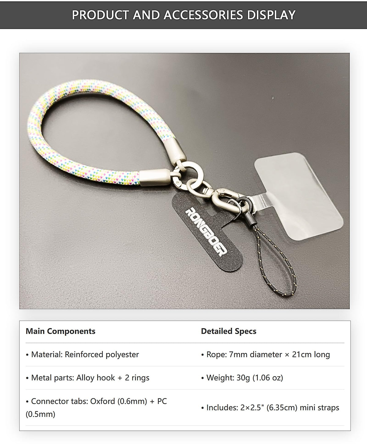 The Rongboer Phone Lanyard Combines Durability And Style With Its 7Mm Thick Polyester Rope And Alloy Metal Accents. Designed For Both Men And Women, This Lightweight (30G) Wrist Strap Features A 19Cm Adjustable Length For Secure Carrying. Includes Two Ultra-Thin (0.6Mm) Connector Tabs (Oxford Cloth & Transparent Pc) For Versatile Phone Attachment.