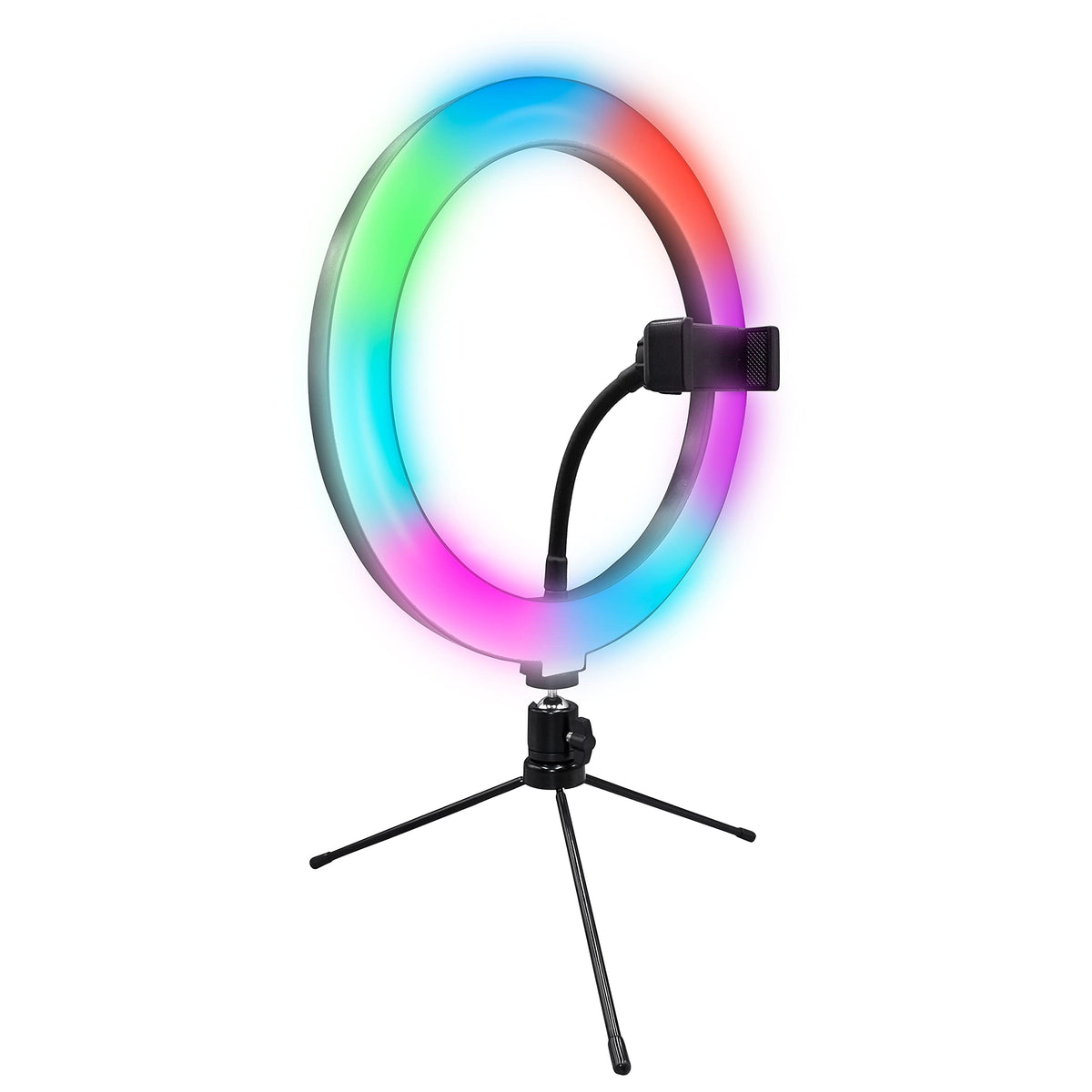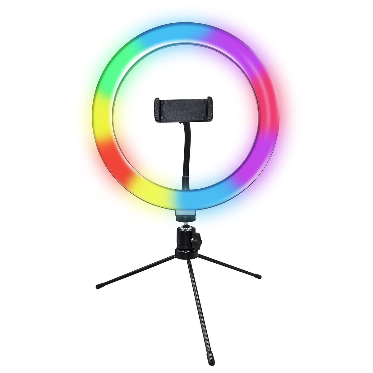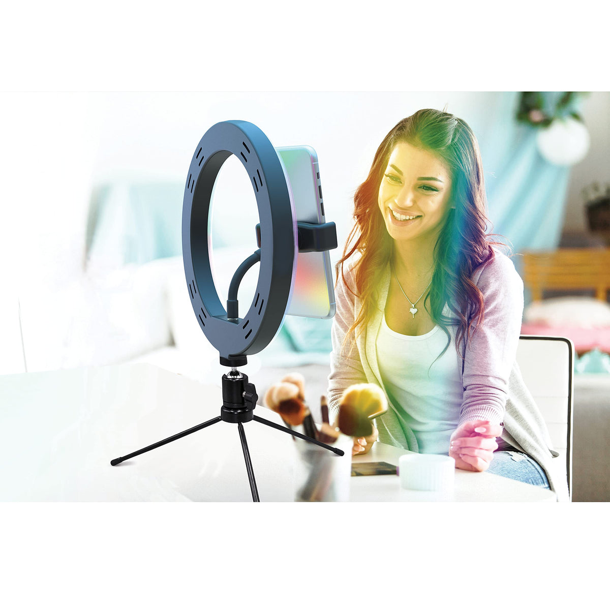 The Supersonic Pro Live Stream 10-In. 150-Led Selfie Rgb Ring Light With Floor Stand Is Great For Live-Streaming, Video Chats, Social Media, And More. The 150-Led Bulb Ring Light Features 3 Color Lighting Modes: Warm Light (3,000K), Cool White (4,500K), Daylight (6,000K), And 10 Brightness Levels. There Are 29 Modes Of Rgb Lights: 19 Static And 10 Dynamic, For The Ideal Lighting Situation. The 360 Rotatable Phone Holder Ensures It Is Easy To Adjust To Desired Angle, And Extends Up To 6.5 In. Wide. It Also Come With An Easily Manageable, Retractable Tripod: Just Lock It At The Desired Height; Extends From 15.76 In. To 45.36 In. With The In-Line Controller, You Are Able To Power On/Off, Switch Lighting Modes, And Adjust Brightness Levels.