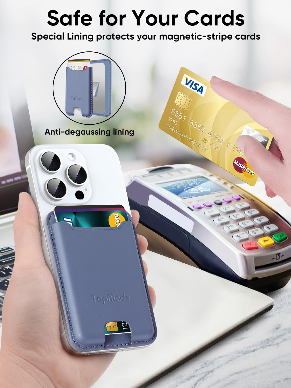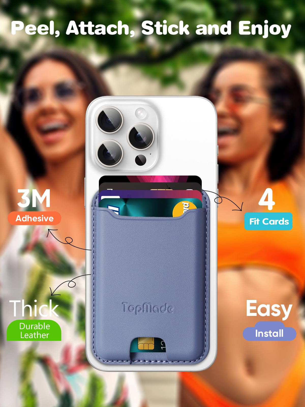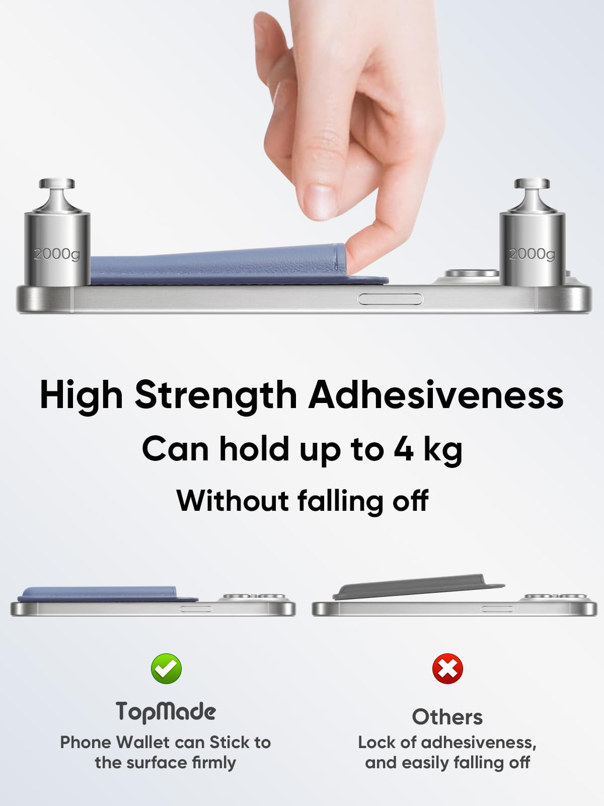 Q: Is the adhesive backing strong enough for daily use?A: Yes, the TopMade Phone Card Holder features a stronger 3M adhesive backing that securely sticks to your phone. It is designed for daily use and can be removed without leaving any sticky residue.