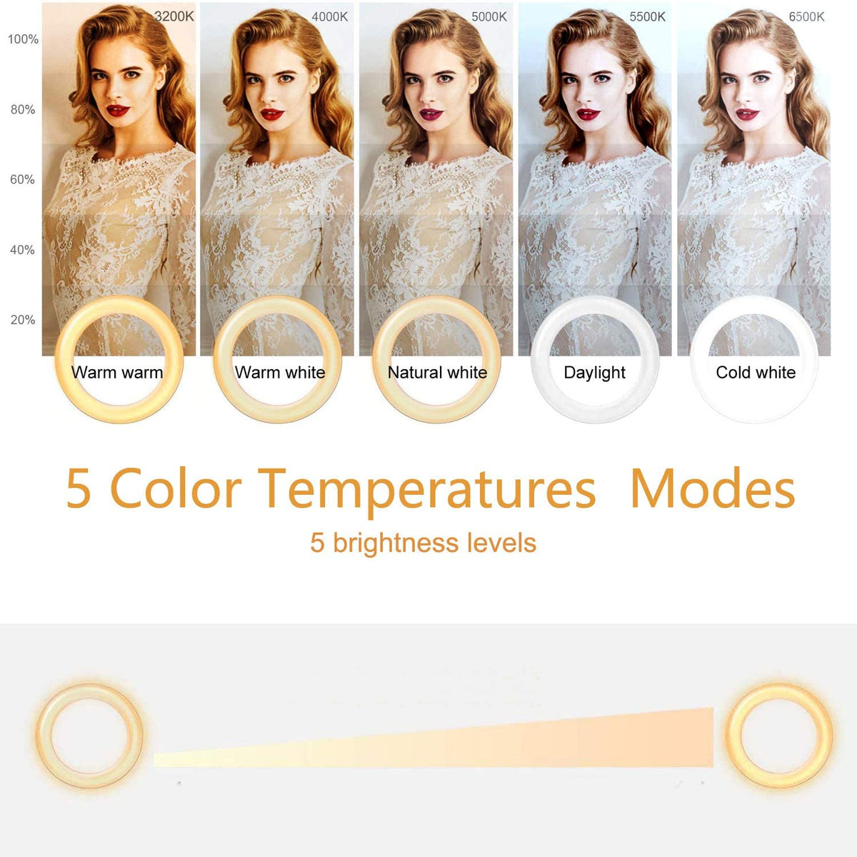 Q: What are the adjustable brightness and color temperature settings of the Ring Light Video Conference Lighting Kit?A: The Ring Light Video Conference Lighting Kit features five levels of brightness and adjustable color temperatures ranging from 3200K to 6500K. This allows users to simulate natural sunlight and achieve the perfect lighting for various scenarios, including video conferencing and content creation.