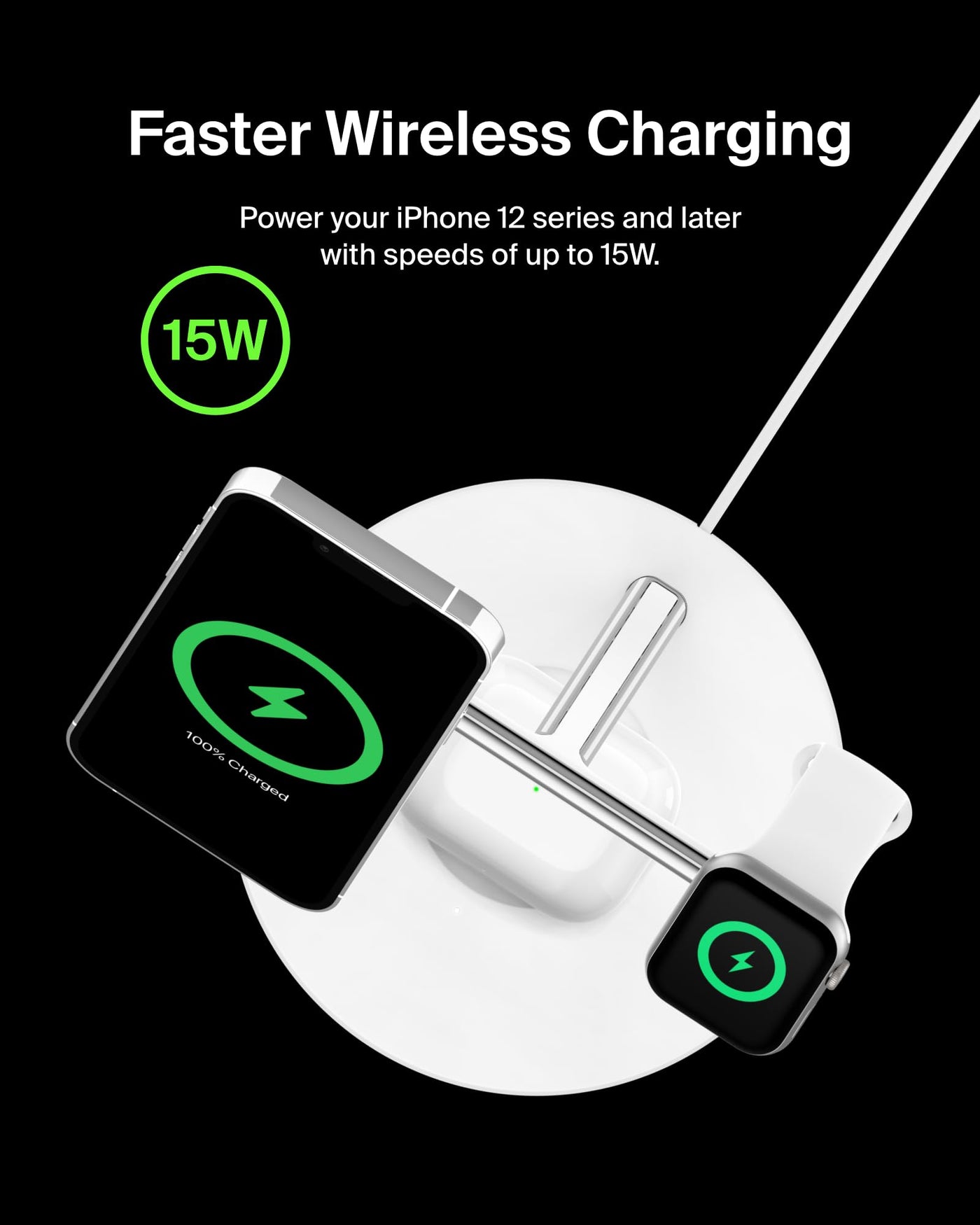 Q: How fast does the Belkin MagSafe Charger charge my iPhone and Apple Watch?A: The Belkin MagSafe Charger supports Apple fast charging technology, delivering up to 15 watts for iPhones and charging Apple Watch Series 7 and newer models 33% faster, allowing you to charge from 0% to 80% in just 45 minutes.