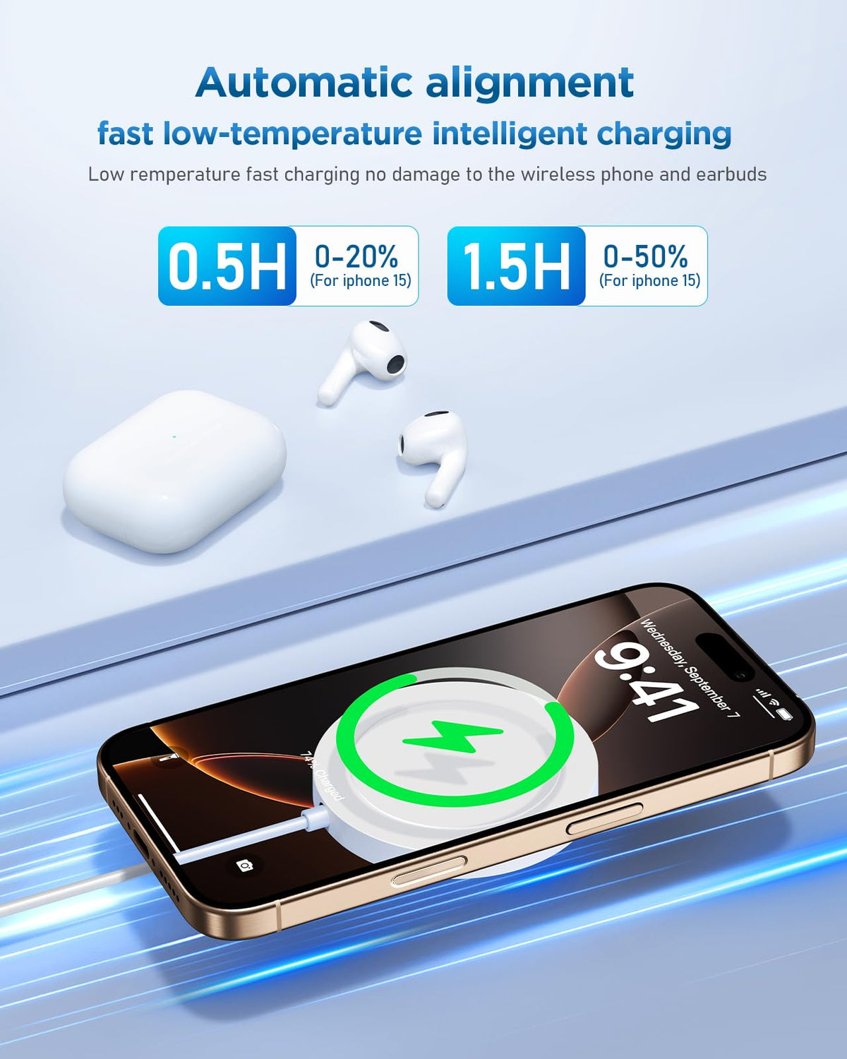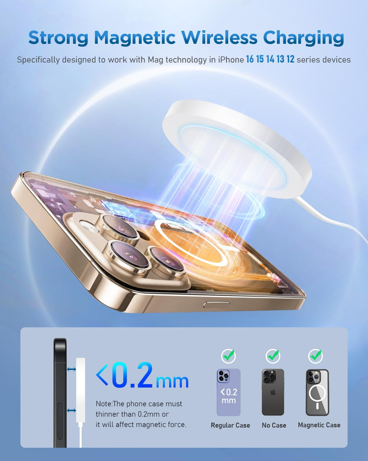 ?Specially Designed For Iphone 16 15 14 13 12 Series?As Aficionados Who Have The New Model Of Iphone, You Can'T Miss The Fresh And Comfortable Charging Experience Through Wireless Charging . The Iphone Magnetic Charger Is Compatible With Iphone 16 15 14, Iphone 16 15 14 Pro, Iphone 16 15 14 Plus, Iphone 16 15 14 Pro Max, Iphone 13 12, Iphone 13 12 Pro, Iphone 13 12 Pro Max, Iphone 13 12 Mini Airpods 3 2 Pro And Other Wireless Devices That With A Professional Magnetic Case | ?Strong Magnetic Suction?The Built-In Strong Magnet Of The Fast Iphone Wireless Charger Makes The Charging Snap. Put The Charging Pad Close To The Back Of The Phone, It Will Automatically And Precisely Adsorb And Start Charging Immediately. You Can Switch The Angle(360