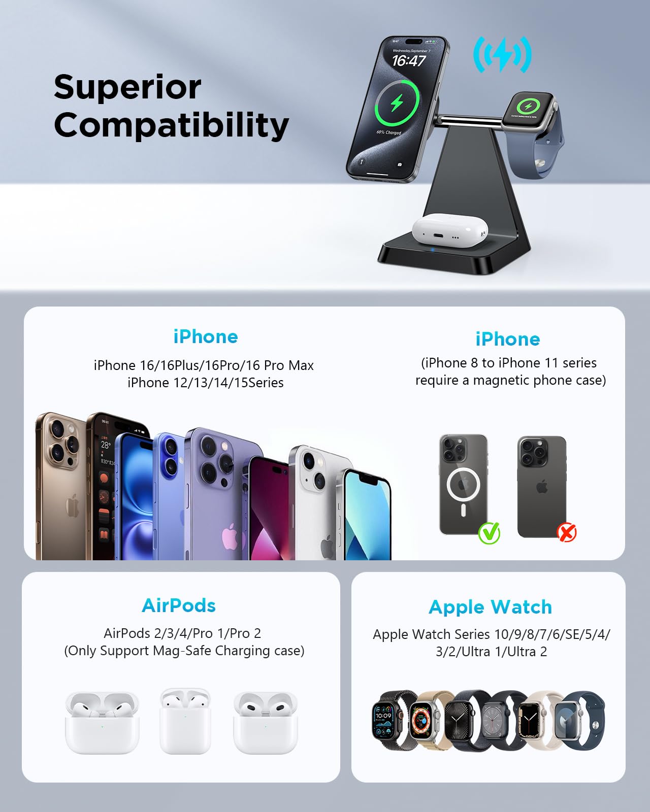 Q: Is the Woruda 3-in-1 Magnetic Wireless Charger compatible with all iPhone models?A: Yes, the Woruda 3-in-1 Magnetic Wireless Charger is compatible with a wide range of iPhone models including the latest iPhone 16 series down to iPhone 12. However, iPhone 8 to iPhone 11 models may require a magnetic phone case for optimal charging.