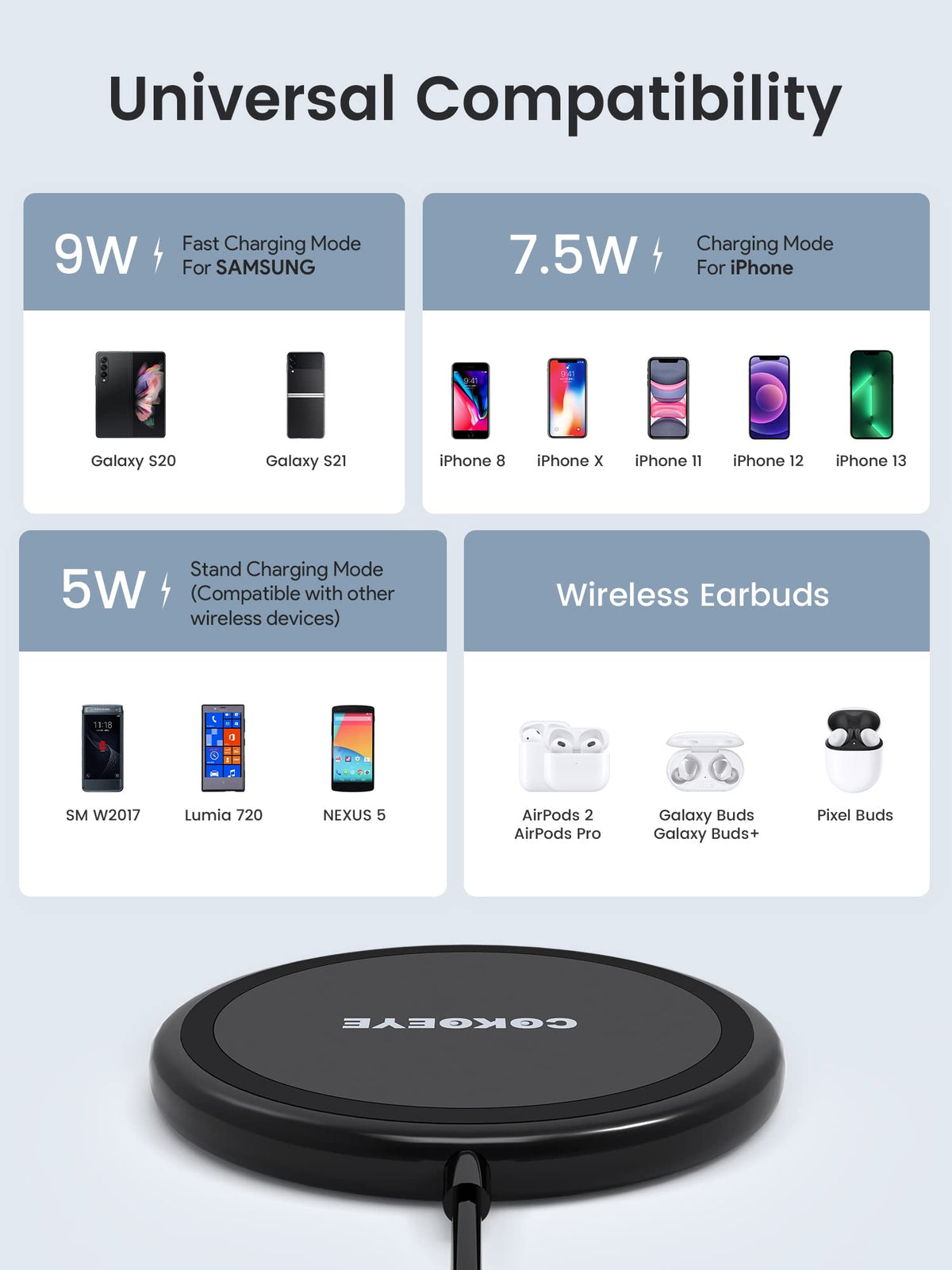 Q: What devices are compatible with the COKOEYE Wireless Charger?A: The COKOEYE Wireless Charger is compatible with a wide range of devices, including the latest iPhone models such as iPhone 16, 16 Plus, 16 Pro, 16 Pro Max, 15, 15 Pro, 15 Plus, 14, 13, and 12. It also supports Samsung devices like the S24, S24 Ultra, S23 Ultra, S22, S21, as well as other smartphones and wireless earbuds that support Qi wireless charging.
