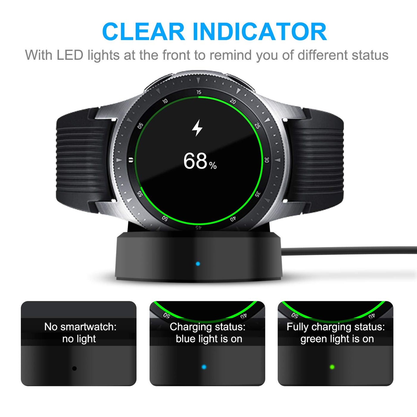 Updated Charger Compatible With Samsung Galaxy Smart Watch 2018 Features Just Plug In And Charge. Good Replacement For The Oem Charger. The Led Indicator Will Not Disturb Your Night Time Sleeping. Good Travel Charger For Samsung Galaxy Watch. Convenient And Portable. You Can Use It As A Backup At Work. The Base Magnetically Hold Onto The Watch And The Watch Charges In The Same Time As Official Samsung Charger. Compatible With Samsung Galaxy Smart Watch Sm-R800 Sm-R810 Sm-R815 Specifics: Input Voltage: 5V 0.7A Output Voltage: 5V 0.5A Material: Pc+Abs Plastic Size: 1.8 X 1.8 X 3.5 In Led Indicator: 1.Fully Charged Status: Green Light Is On 2.Charging Status: Blue Light Is On Note Wall Plug Is Not Included. Getting Warm Is A Normal Phenomenon.Please Unplug The Charger After Charging To Avoid Unnecessary Warming.Please Make Sure That Your Charging Current Is Below 1A. We Suggest That You Charge Your Dock Through Computer Usb Port.