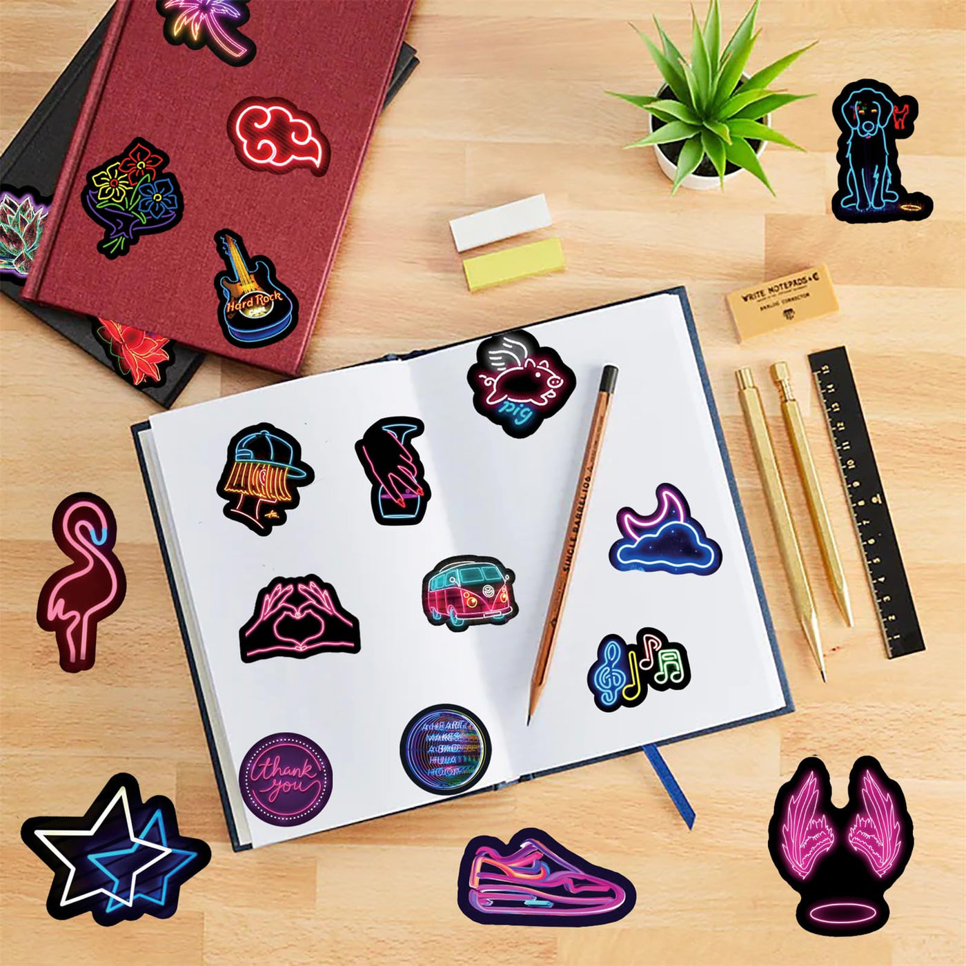 100Pcs Cool Neon Light Stickers For Kids Teens Adults, Trendy Graffiti Waterproof Vinyl Neon Stickers Pack For Water Bottle, Gui